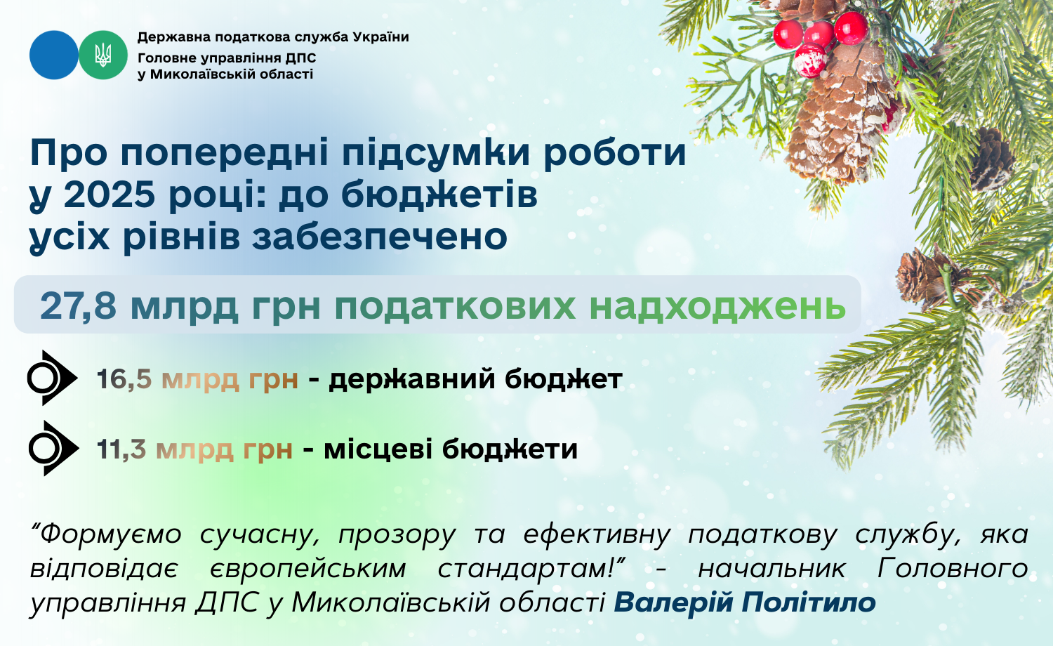 За оперативними даними станом на 29.12.2025 року до бюджетів усіх рівнів надійшло 27,8 млрд грн податкових платежів. З них 11,3 млрд грн спрямовані до місцевих бюджетів області, майже 16,5 млрд грн - до державного бюджету, ще 17,1 млрд грн становить єдиний внесок до Пенсійного фонду України.