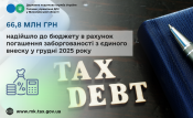 За грудень в рахунок погашення заборгованості з єдиного внеску до бюджету надійшло 66,8 млн грн, що перевищує доведений показник у 9 разів. Самостійно погашено платниками заборгованість з єдиного внеску в сумі 63,3 млн грн, від органів державної виконавчої служби надійшло в рахунок заборгованості 3,5 млн гривень.