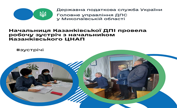 Начальниця Казанківської ДПІ ГУ ДПС у Миколаївській області Тетяна Кривцова провела робочу зустріч з начальником відділу ЦНАП Казанківської ОТГ Людмилою Тимощук. Під час зустрічі було розглянуто новації, які відбулись та відбуваються в податковій системі та законодавчі зміни, які у тому числі вплинули на роботу ЦНАП Казанківської ОТГ.