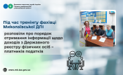 У Миколаївській ДПІ Головного управління ДПС у Миколаївській області проведено навчання-тренінг з платниками податків щодо отримання послуги з надання інформації про доходи з Державного реєстру фізичних осіб – платників податків.