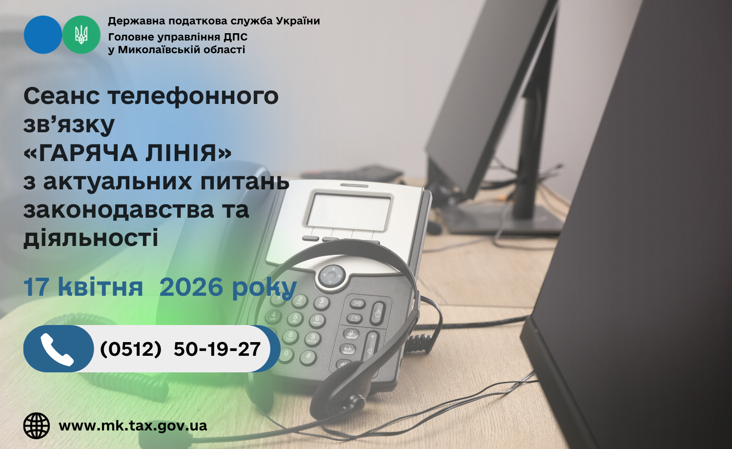 Головне управління ДПС у Миколаївській області проводитьз 13 год. 00 хв. до 14 год. 00 хв. 17 квітня 2026 року сеанс телефонного зв’язку «гаряча лінія» з актуальних питань законодавства та діяльності