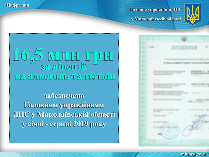 У січні - серпні 2019 року Головним управлінням ДПС у Миколаївській області мобілізовано до місцевих бюджетів 16,5 млн грн плати за ліцензії на право торгівлі алкогольними напоями та плати за ліцензії на право торгівлі тютюновими виробами.