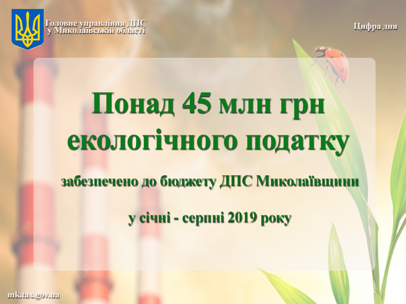 У січні - серпні 2019 року Головним управлінням ДПС у Миколаївській області забезпечено надходження до бюджету екологічного податку у сумі 45,4 млн грн, у т.ч.: до державного бюджету – 25,8 млн грн, до місцевих бюджетів – 19,6 млн гривень.