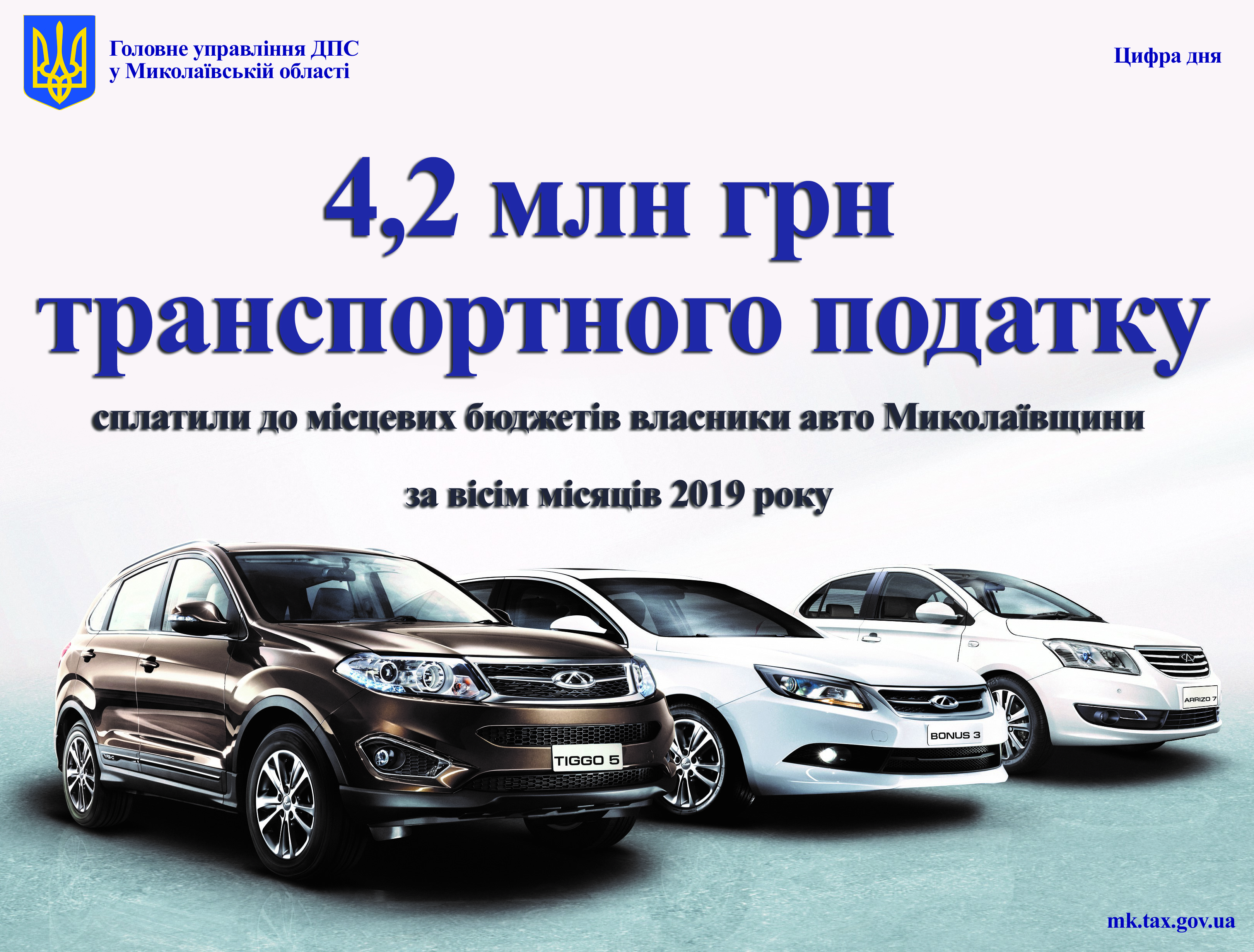 Головне управління ДПС у Миколаївській області повідомляє, що до місцевих бюджетів Миколаївської області забезпечено 4,2 млн грн транспортного податку. Так, власниками легкових автомобілів – юридичними особами до місцевих бюджетів сплачено 2,4 млн грн транспортного податку, фізичними особами – 1,8 млн гривень.