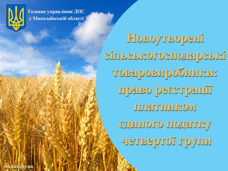 Головне управління ДПС у Миколаївській області повідомляє, що відповідно до пп.291.4.7 п.291.4 ст.291 Податкового кодексу України (далі – ПКУ) новоутворені, зокрема, сільськогосподарські товаровиробники – юридичні особи можуть бути платниками податку з наступного року, якщо частка сільськогосподарського товаровиробництва, отримана за попередній податковий (звітний) рік, дорівнює або перевищує 75 відсотків.