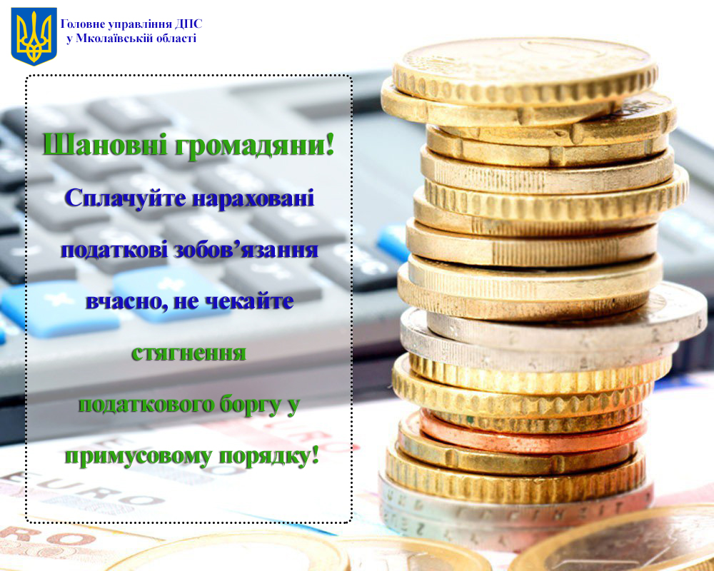 Головне управління ДПС у Миколаївській області повідомляє, що відповідно до пп.14.1.175 п.14.1 ст.14 Податкового кодексу України (далі – ПКУ) податковий борг – це сума узгодженого грошового зобов'язання, не сплаченого платником податків у встановлений строк, та непогашеної пені, нарахованої у порядку, визначеному ПКУ. Обов’язок людини і громадянина щодо сплати податків і зборів у порядку і розмірах, встановлених законом, визначено ст.67 Конституції України.