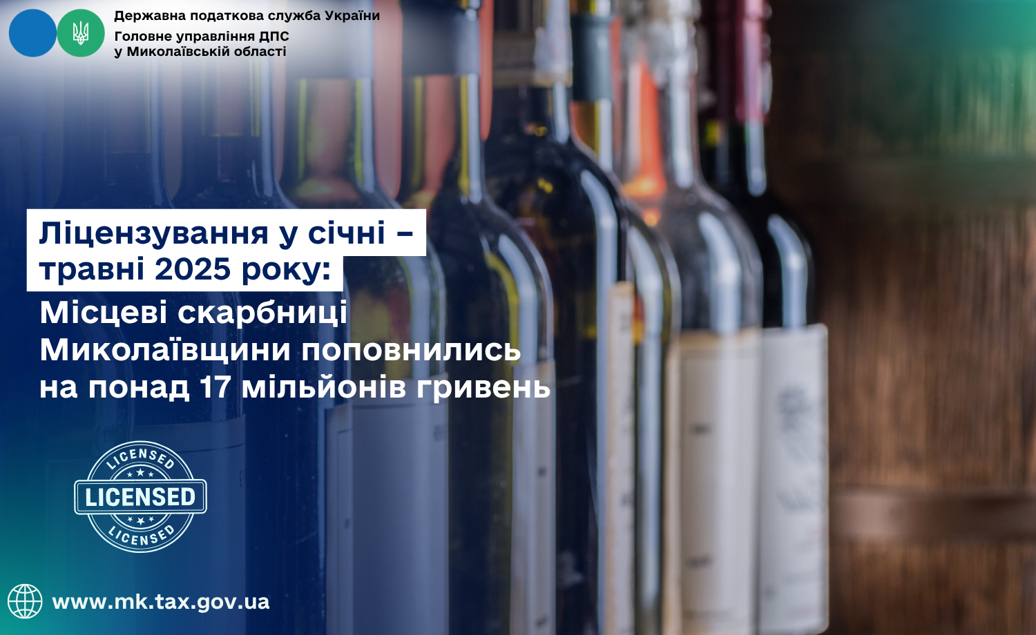 В управлінні контролю за підакцизними товарами Головного управління ДПС у Миколаївській області повідомили, що у січні – травні 2025 року до місцевих бюджетів надійшло 17,1 млн грн плати за ліцензії на виробництво: спирту коньячного і алкогольних напоїв, плати за ліцензії на право: оптової, роздрібної торгівлі алкогольними напоями, тютюновими виробами, рідинами, що використовуються в електронних сигаретах, та пальним. Порівняно з відповідним періодом минулого року надходження збільшились на 5,2 млн грн, або на 43,3 відсотка.