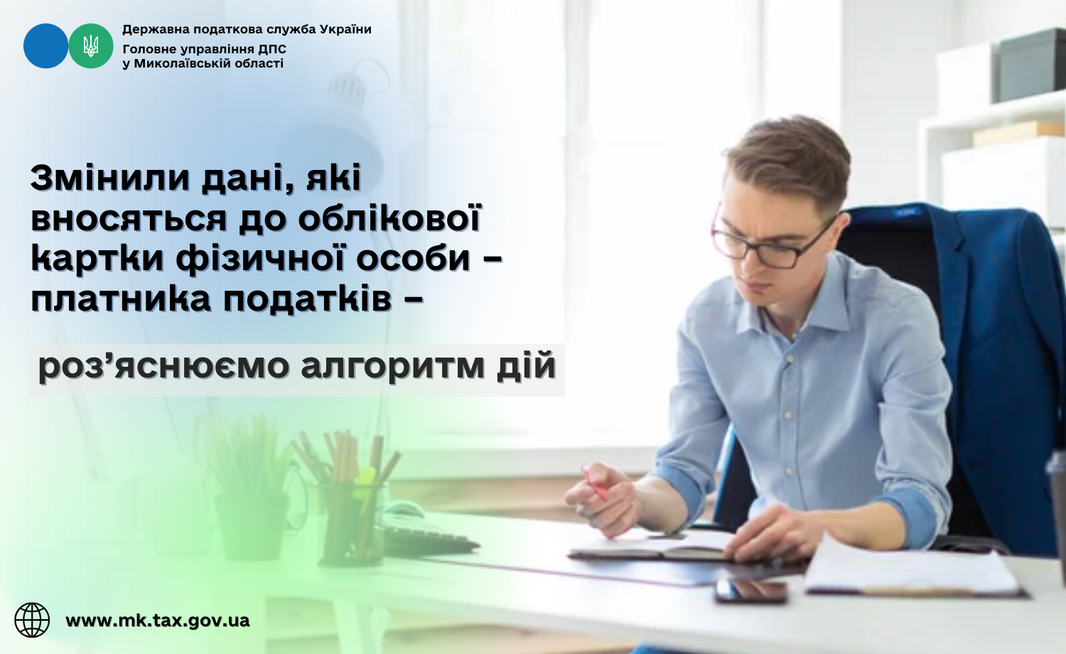 Головне управління ДПС у Миколаївській області повідомляє, що відповідно до п. 70.7 ст. 70 Податкового кодексу України від 02 грудня 2010 року № 2755-VI та п. 1 розд. IХ Положення про реєстрацію фізичних осіб у Державному реєстрі фізичних осіб – платників податків, затвердженого наказом Міністерства фінансів України від 29.09.2017 № 822 із змінами та доповненнями (далі – Положення № 822) фізичні особи – платники податків зобов’язані подавати до контролюючих органів (далі – податкові органи) відомості про зміну даних, які вносяться до облікової картки фізичної особи – платника податків протягом місяця з дня виникнення таких змін шляхом подання заяви про внесення змін до Державного реєстру фізичних осіб – платників податків за формою № 5ДР (далі – Заява за ф. № 5ДР) (додаток 12 до Положення № 822) та документа, що посвідчує особу (після пред’явлення повертається).