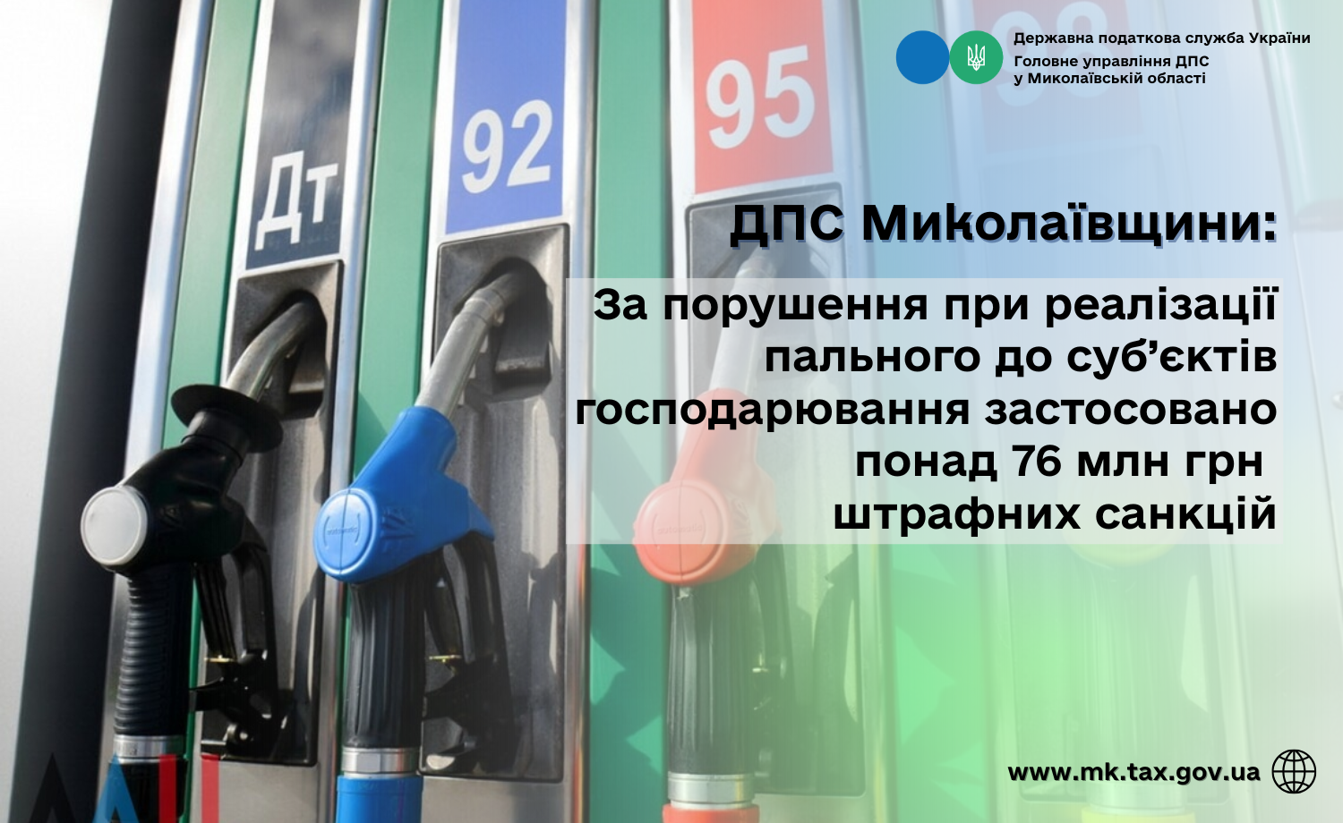 Так, під час проведення контрольно-перевірочних заходів на території Миколаївської області встановлені порушення вимог Податкового кодексу України, зокрема: оптова торгівля пальним здійснювалась без наявності відповідної діючої ліцензії. До суб’єкта господарювання передбачено застосування штрафних санкцій у сумі понад 76 млн гривень.