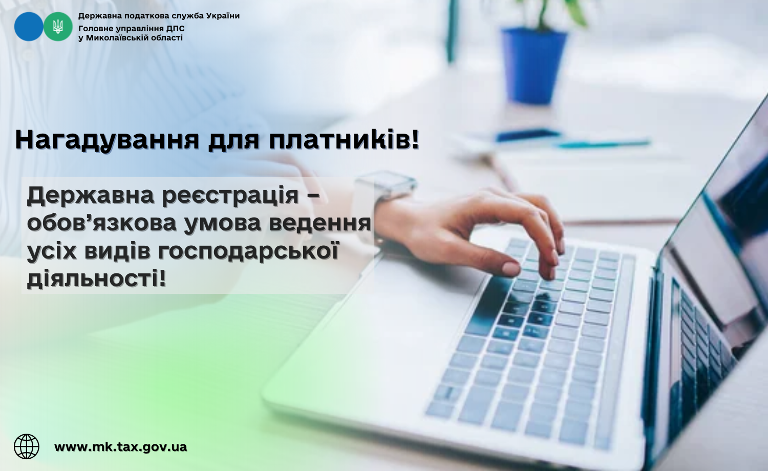 Головне управління ДПС у Миколаївській області вкотре наголошує, що державна реєстрація суб’єктів господарювання – обов’язкова умова здійснення усіх видів підприємницької діяльності та запорука законності її ведення.