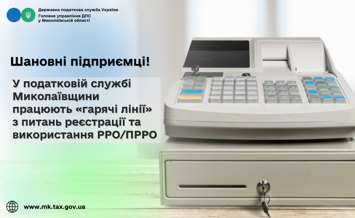 - Шановні підприємці! У податковій службі Миколаївщини працюють «гарячі лінії» з питань реєстрації та використання РРО/ПРРО