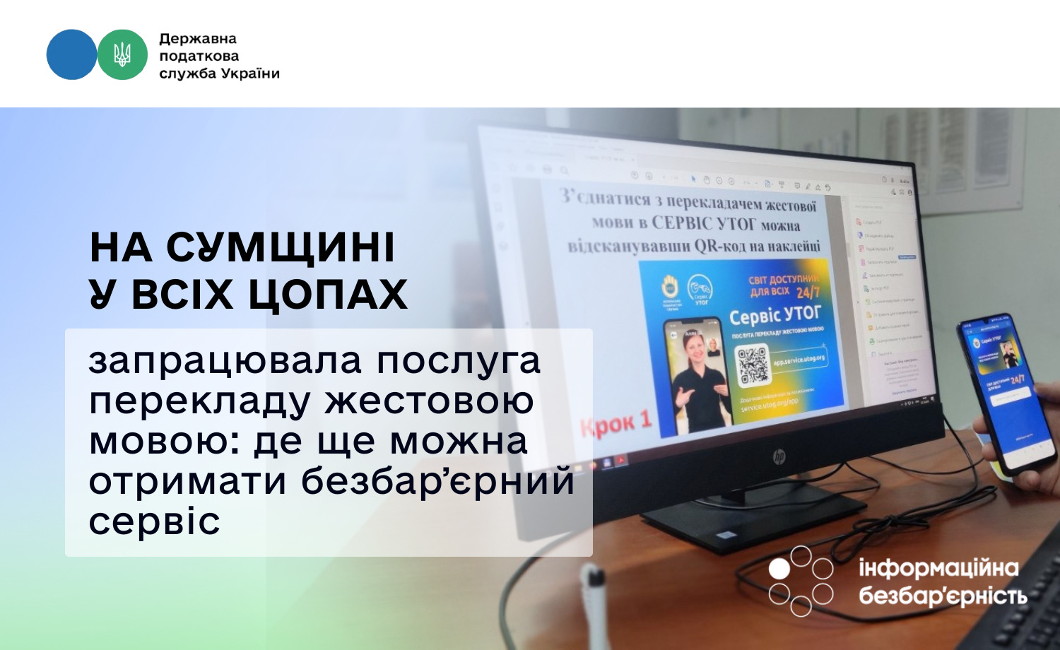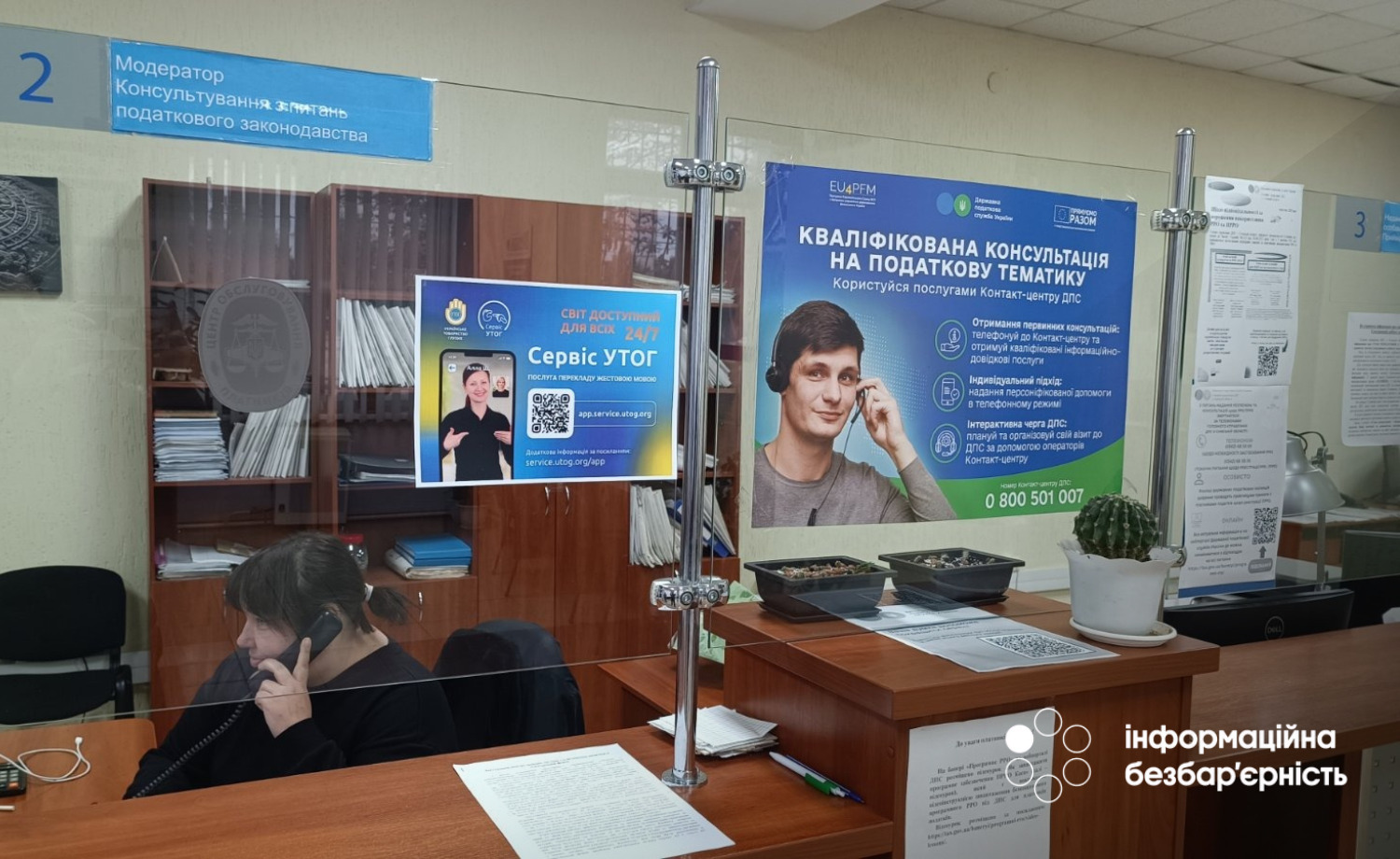 У Центрах обслуговування платників у Волинській, Донецькій, Закарпатській, Запорізькій, Львівській, Рівненській, Тернопільській, Чернівецькій областях та у місті Києві відвідувачі з порушеннями слуху можуть скористатися послугами перекладу жестовою мовою.