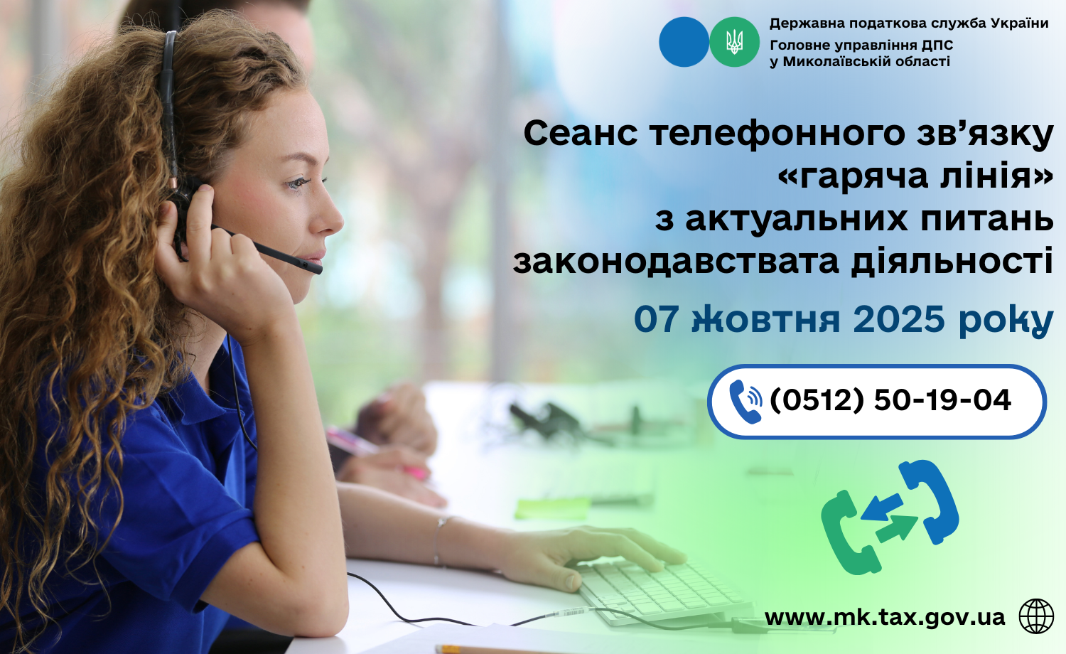 Головне управління ДПС у Миколаївській області проводить з 10 год. 00 хв. до 11 год. 00 хв. 07 жовтня 2025 року сеанс телефонного зв’язку «гаряча лінія» з актуальних питань законодавства та діяльності