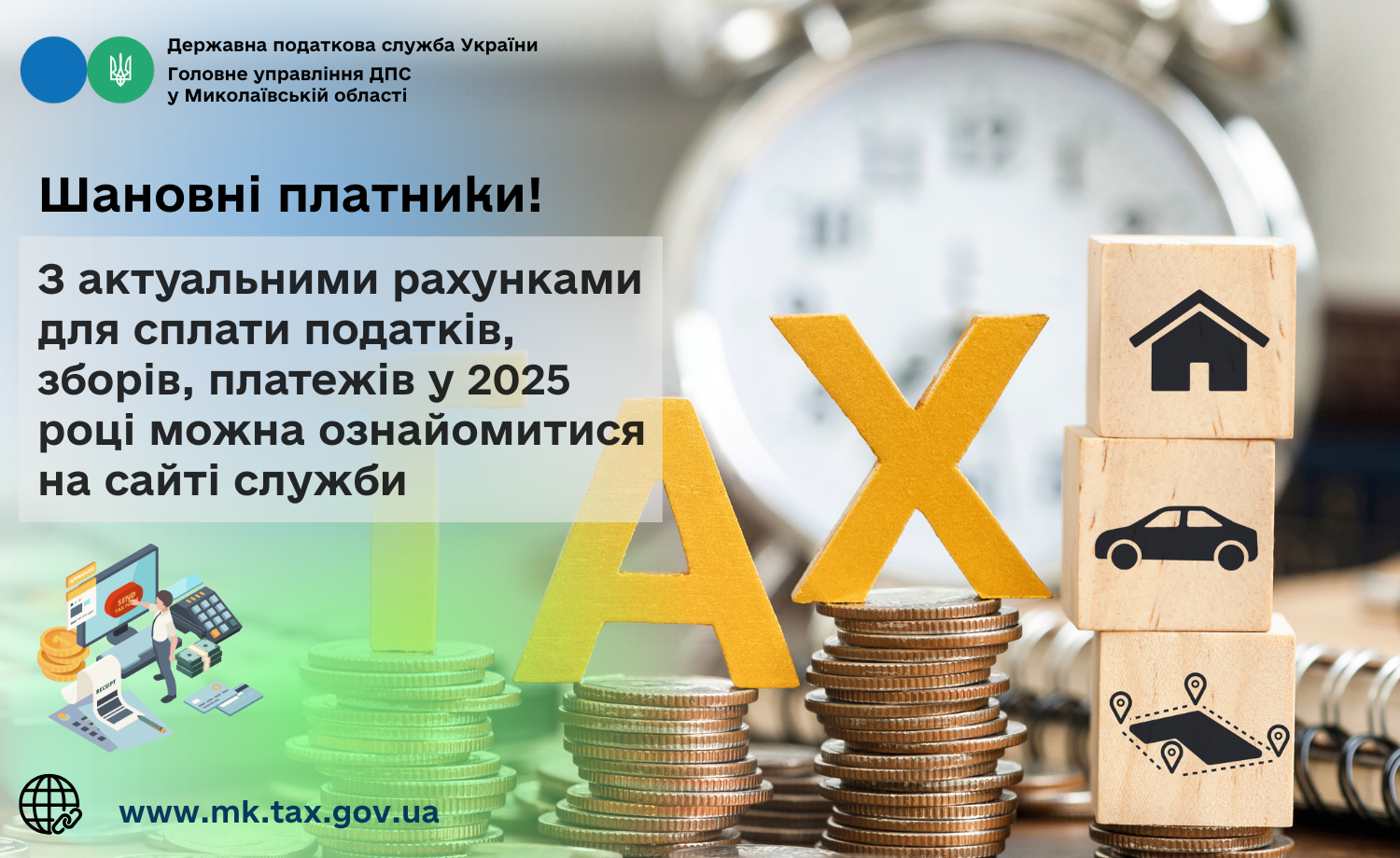 Реквізити рахунків для сплати податків, зборів та платежів до державного та місцевих бюджетів по Миколаївській області розміщено за покликанням: https://tax.gov.ua/data/files/573111.xls.