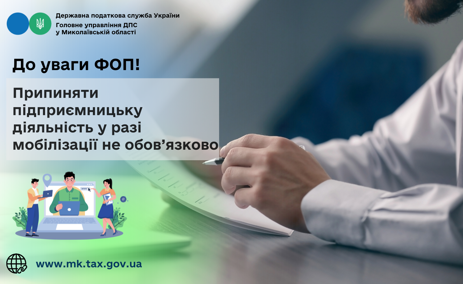 Головне управління ДПС у Миколаївській області повідомляє, що відповідно до частини 3 статті 39 Закону України «Про військовий обов'язок і військову службу» за громадянами України, які призвані на строкову військову службу, військову службу за призовом під час мобілізації, на особливий період, або прийняті на військову службу за контрактом, у разі виникнення кризової ситуації, що загрожує національній безпеці, оголошення рішення про проведення мобілізації та (або) введення воєнного стану на строк до закінчення особливого періоду або до оголошення рішення про демобілізацію, не припиняється державна реєстрація підприємницької діяльності фізичних осіб-підприємців (далі – ФОП).