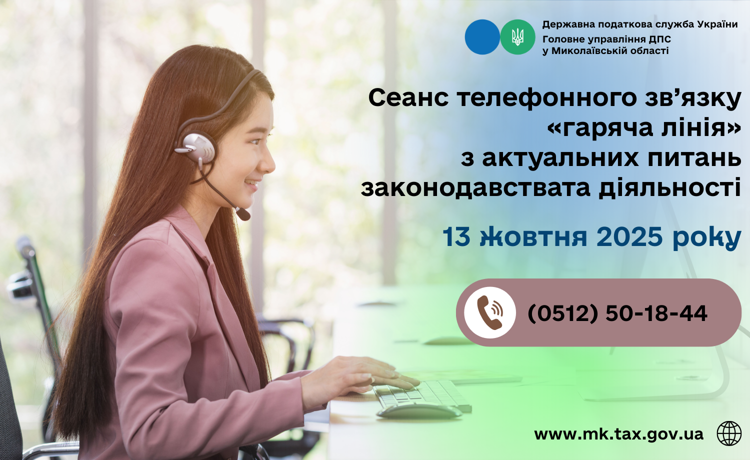 Головне управління ДПС у Миколаївській області проводить з 10 год. 00 хв. до 11 год. 00 хв. 13 жовтня 2025 року сеанс телефонного зв’язку «гаряча лінія» з актуальних питань законодавства та діяльності