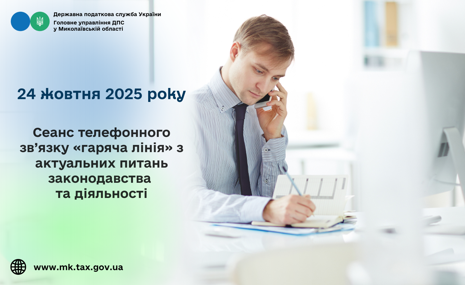 Головне управління ДПС у Миколаївській області проводить з 13 год. 00 хв. до 14 год. 00 хв. 24 жовтня 2025 року сеанс телефонного зв’язку «гаряча лінія» з актуальних питань законодавства та діяльності