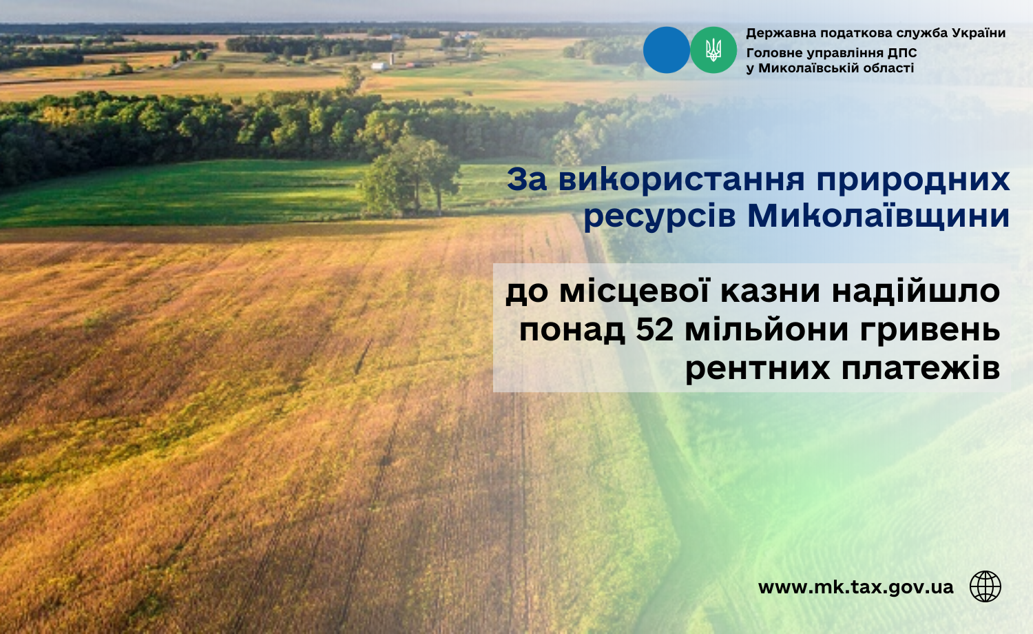 Головне управління ДПС у Миколаївській області зазначає, що у січні – вересні 2025 року до місцевих скарбниць забезпечено 52,1 млн грн рентної плати за користування природними ресурсами.