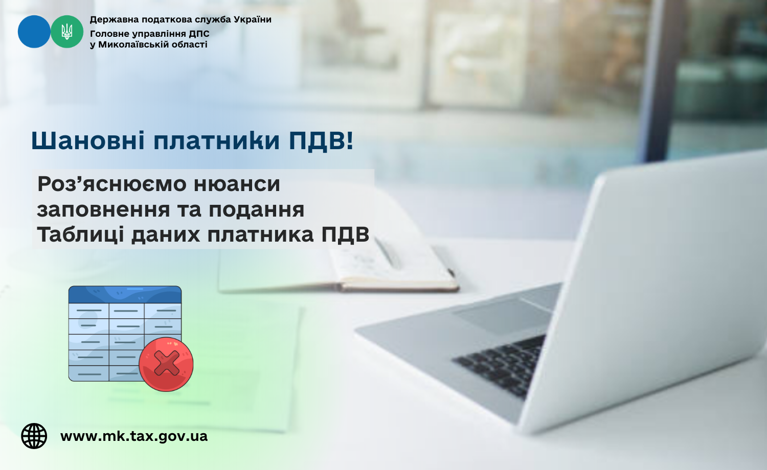 Головне управління ДПС у Миколаївській області повідомляє, що подання Таблиці даних платника ПДВ передбачено Порядком зупинення реєстрації податкової накладної/розрахунку коригування в Єдиному реєстрі податкових накладних, затвердженим постановою Кабінету Міністрів України від 11 грудня 2019 року № 1165 «Про затвердження порядків з питань зупинення реєстрації податкової накладної/розрахунку коригування в Єдиному реєстрі податкових накладних» (із змінами і доповненнями) (далі Порядок).