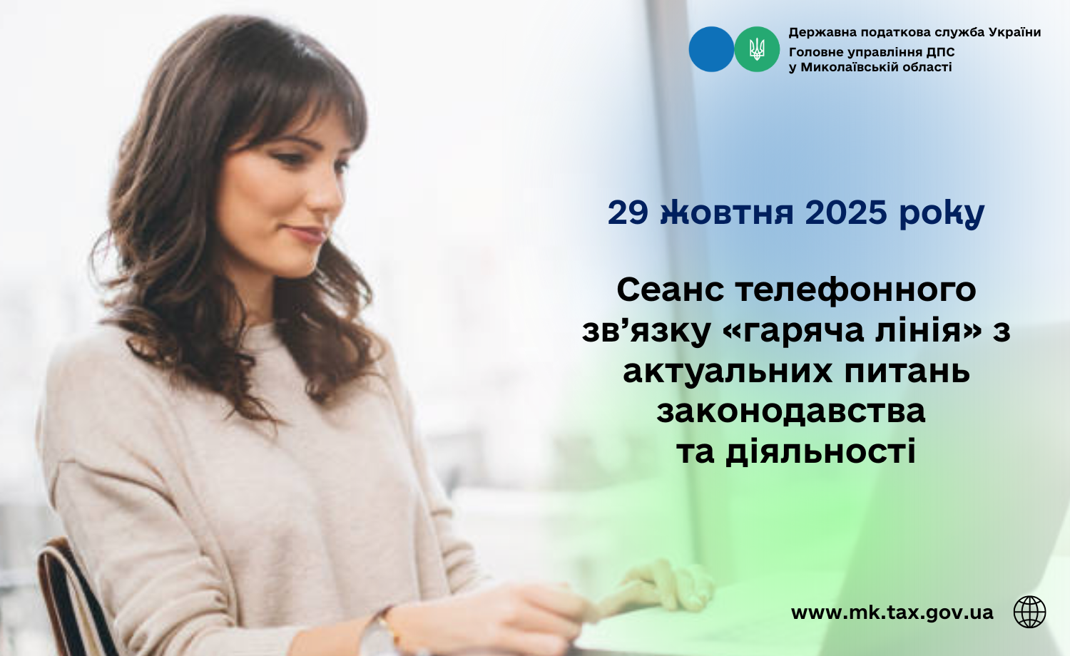 Головне управління ДПС у Миколаївській області проводить з 10 год. 00 хв. до 11 год. 00 хв. 29 жовтня 2025 року сеанс телефонного зв’язку «гаряча лінія» з актуальних питань законодавства та діяльності