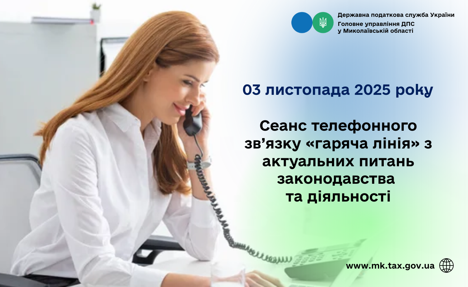 Головне управління ДПС у Миколаївській області проводить з 10 год. 00 хв. до 11 год. 00 хв. 03 листопада 2025 року сеанс телефонного зв’язку «гаряча лінія» з актуальних питань законодавства та діяльності