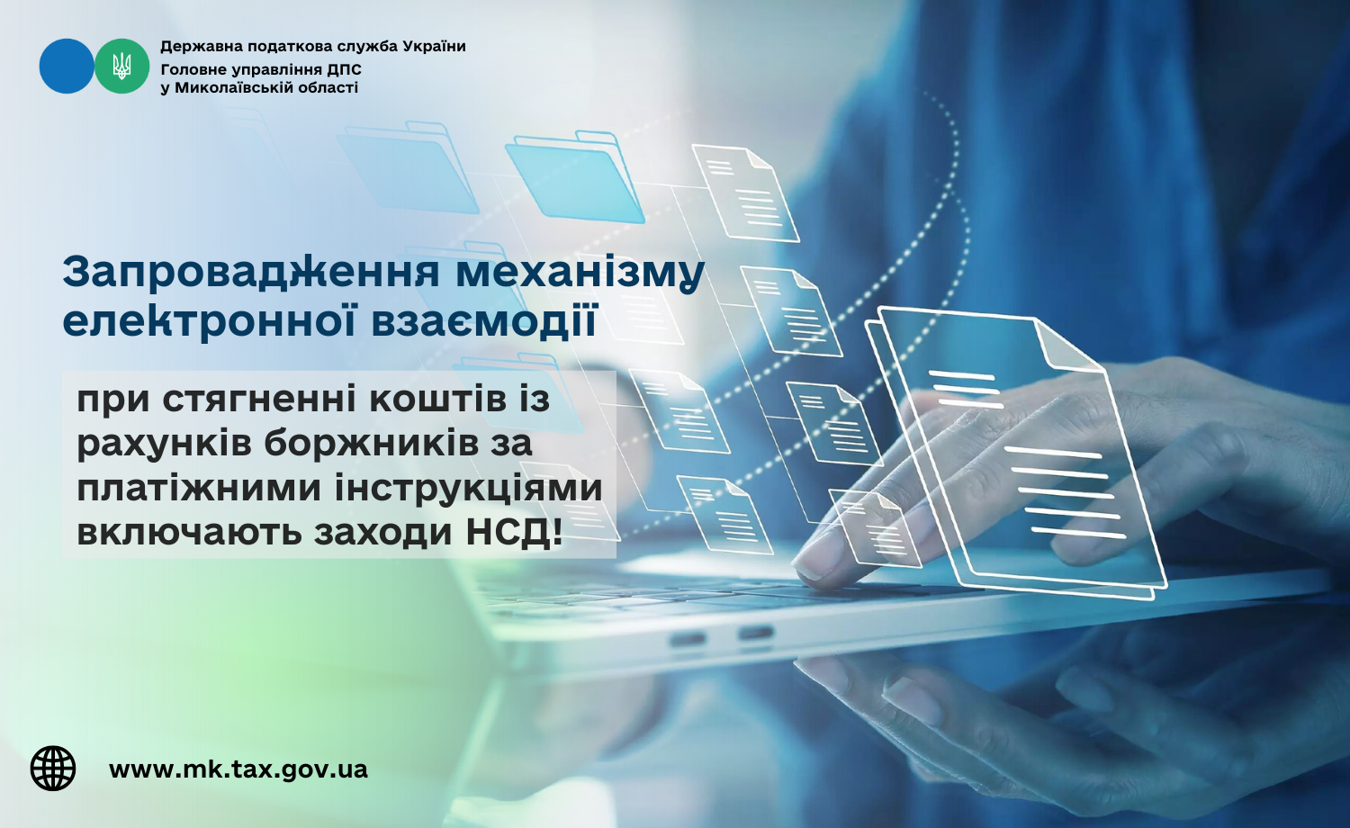 Серед заходів ДПС із впровадження НСД у 2024 – 2025 роках, зокрема удосконалення процедури стягнення коштів із банківських рахунків боржників шляхом налагодження інформаційної взаємодії ДПС із Держказначейством та банками щодо направлення електронних платіжних інструкцій (інкасових доручень) на примусове списання (стягнення) коштів із рахунків платника у банках. Виконання цієї процедури передбачає законодавче запровадження механізму електронної взаємодії при стягненні коштів із рахунків боржників за платіжними інструкціями, сформованими в електронній формі.