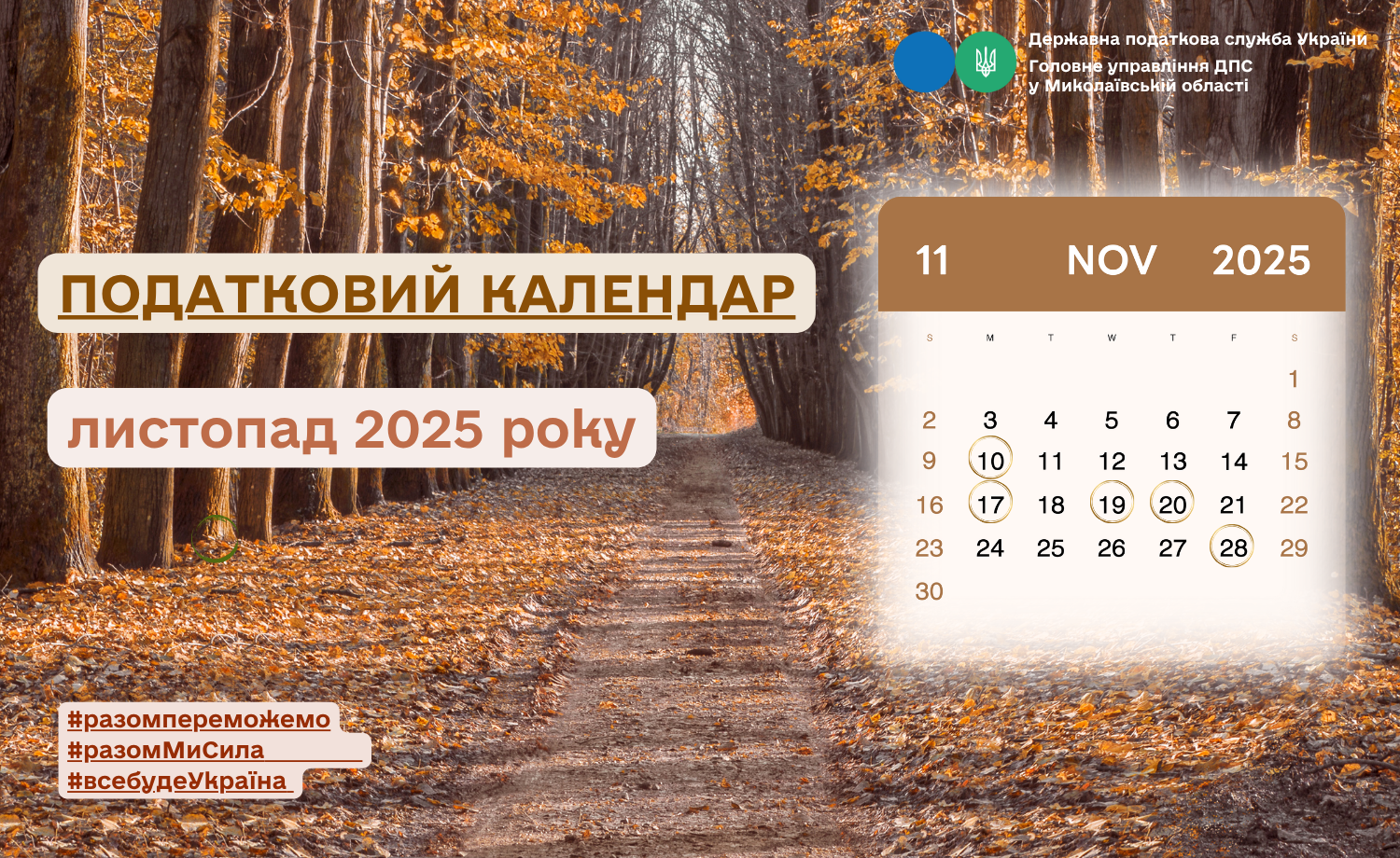 Головне управління ДПС у Миколаївській області надає інформацію щодо термінів подання звітності та сплати податків і зборів у листопаді 2025 року.
