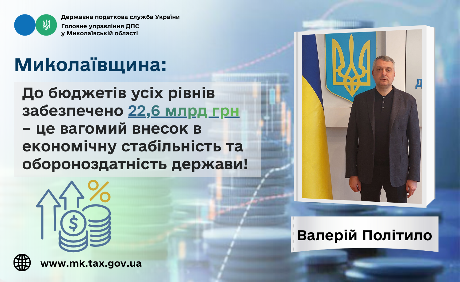 У січні – жовтні 2025 року до бюджетів усіх рівнів за платежами, контроль за справлянням яких покладено на Головне управління ДПС у Миколаївській області, забезпечено 22,6 млрд грн, що на 23,7 відс., або на 4,3 млрд грн більше, ніж у аналогічному періоді минулого року Це результат спільних зусиль відповідального бізнесу, громадськості та податківців, - зазначив у своєму коментарі начальник Головного управління ДПС у Миколаївській області Валерій Політило.