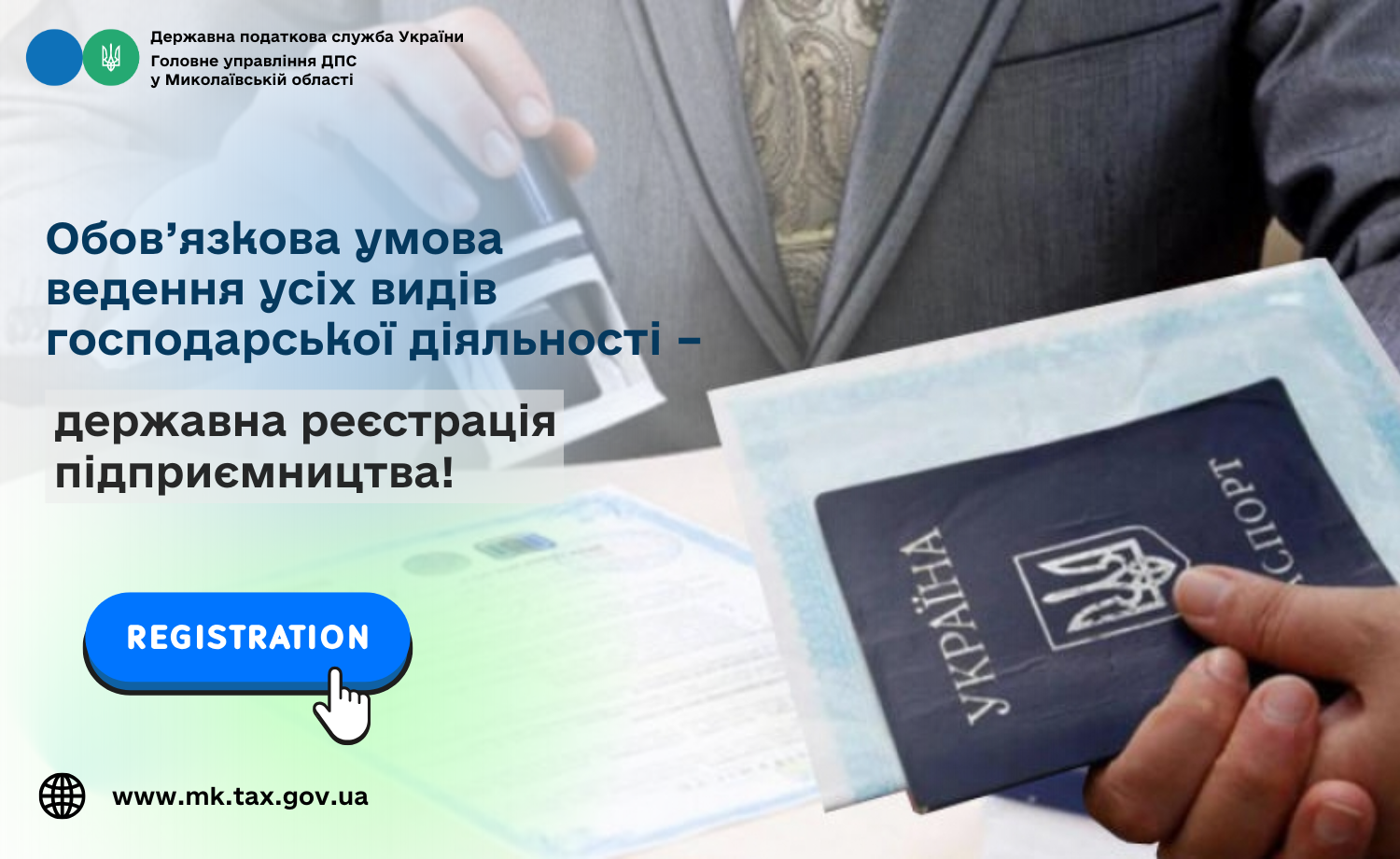 Головне управління ДПС у Миколаївській області вкотре наголошує, що державна реєстрація суб’єктів господарювання – обов’язкова умова здійснення усіх видів підприємницької діяльності та запорука законності її ведення.