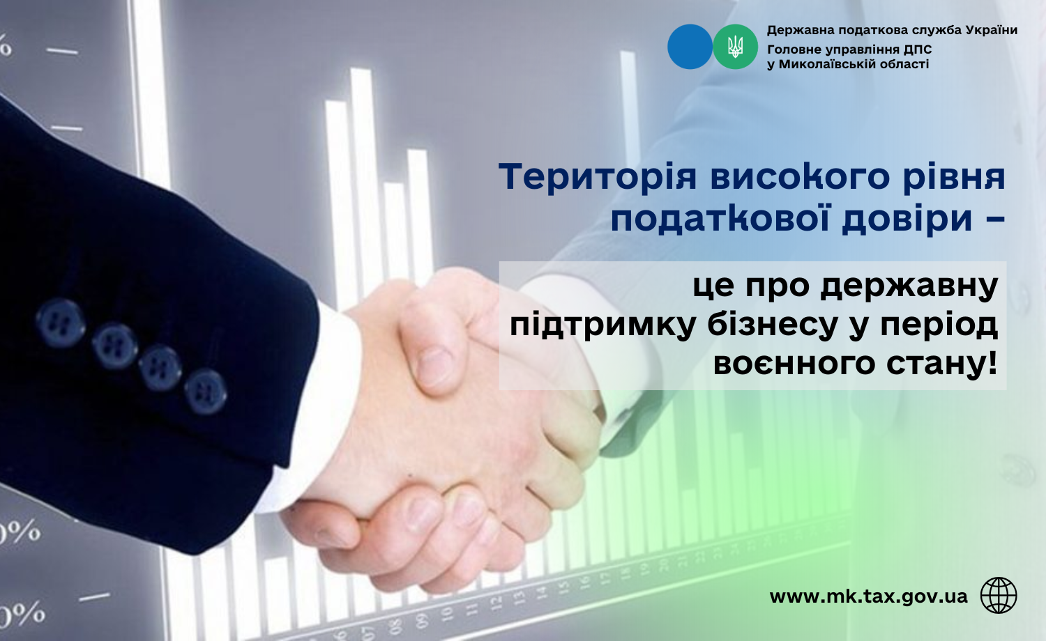 Головне управління ДПС у Миколаївській області повідомляє, що Державна податкова служба розгорнула новий проєкт – Територія високого рівня податкової довіри. Оскільки в умовах воєнного стану бізнес, який продовжує працювати і сплачувати податки, то потребує підтримки від держави.