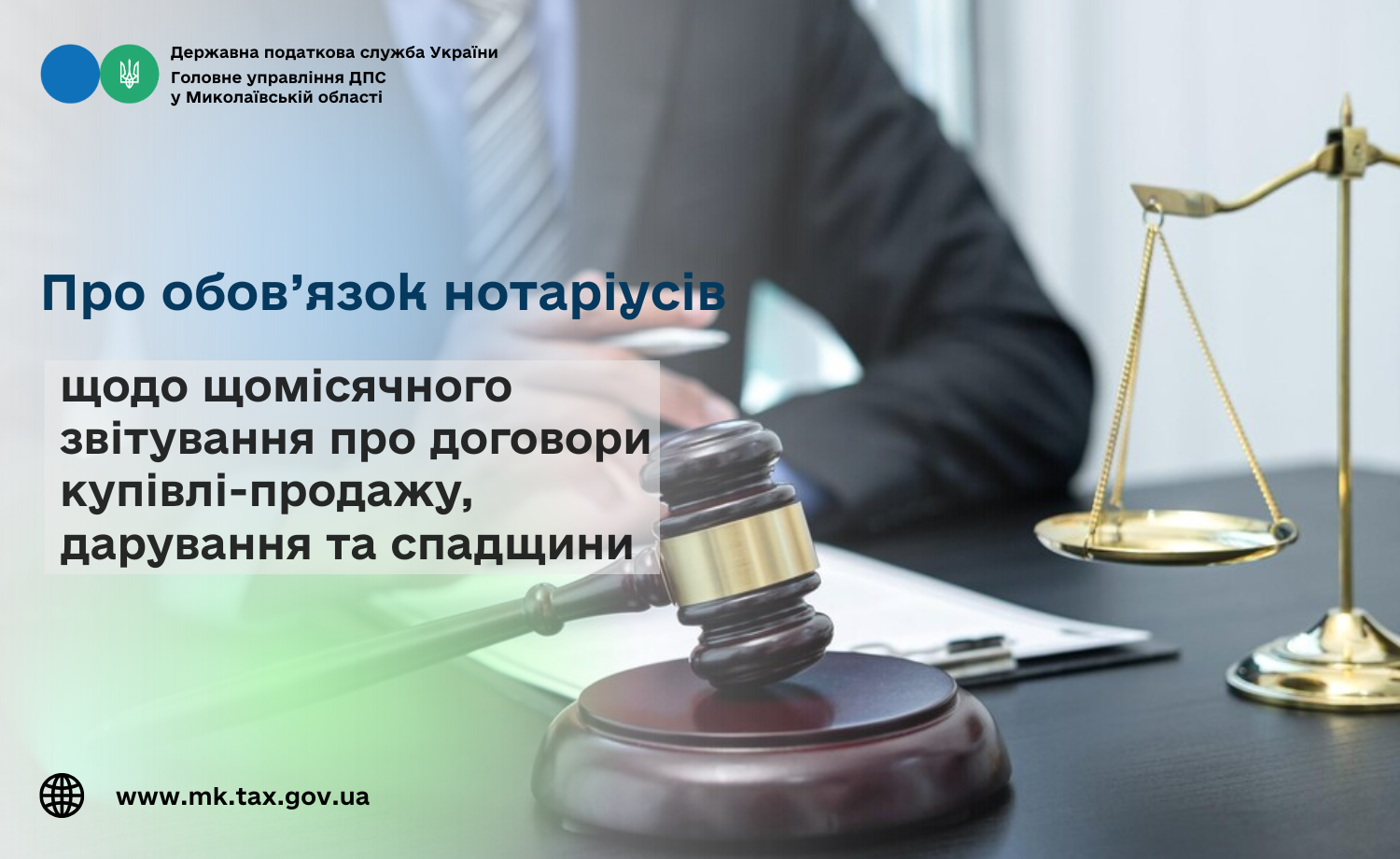 Головне управління ДПС у Миколаївській області повідомляє, що нотаріуси зобов’язані щомісячно подавати до контролюючого органу інформацію про посвідчені договори купівлі-продажу рухомого і нерухомого майна, дарування та свідоцтва про право на спадщину.