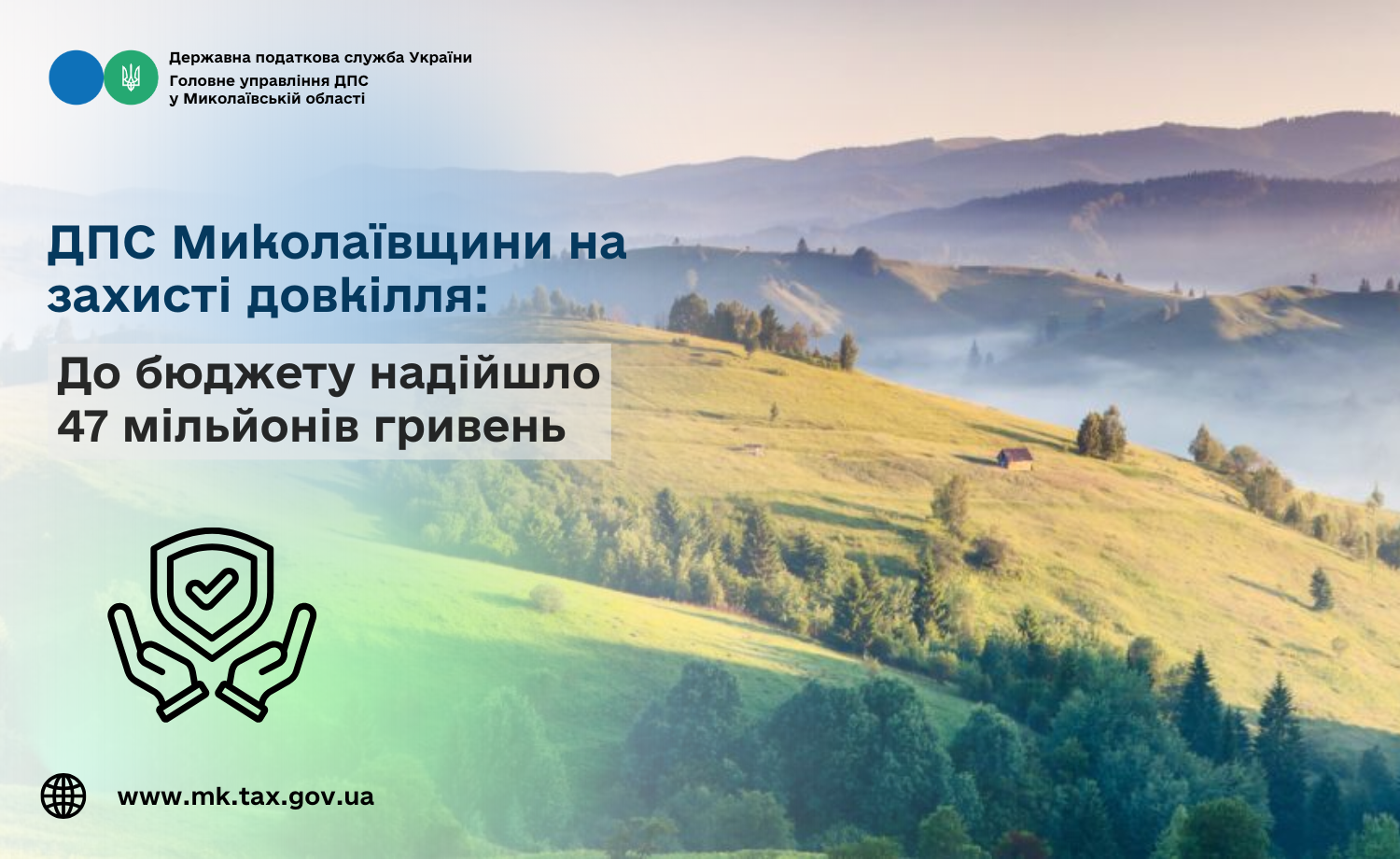 Головне управління ДПС у Миколаївській області повідомляє, що у січні – жовтні 2025 року до бюджетів усіх рівнів забезпечено екологічного податку у сумі 47 млн грн, зокрема до державного бюджету – 30 млн грн, до місцевих бюджетів – 17 млн гривень.