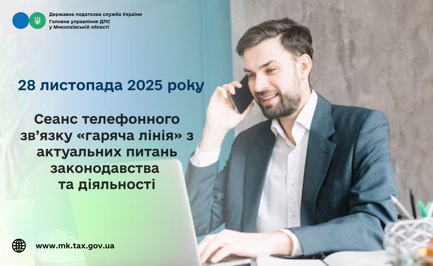 Головне управління ДПС у Миколаївській області проводить з 13 год. 00 хв. до 14 год. 00 хв. 28 листопада 2025 року сеанс телефонного зв’язку «гаряча лінія» з актуальних питань законодавства та діяльності