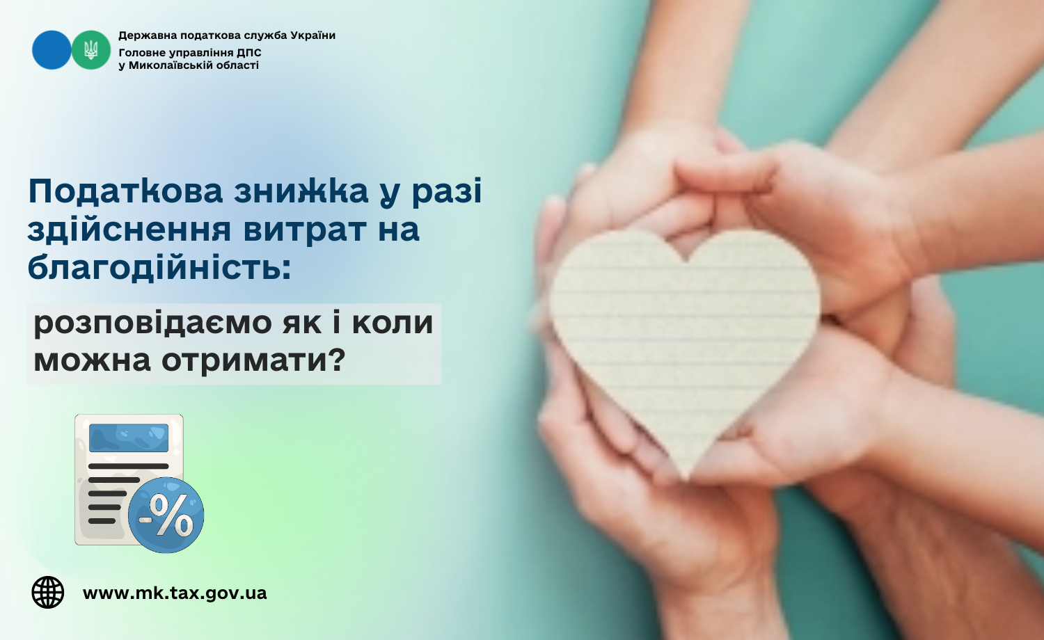 Головне управління ДПС у Миколаївській області повідомляє, що в рамках проведення кампанії декларування доходів громадяни мають можливість скористатися податковою знижкою, якщо вони упродовж звітного року здійснювали витрати на благодійність.
