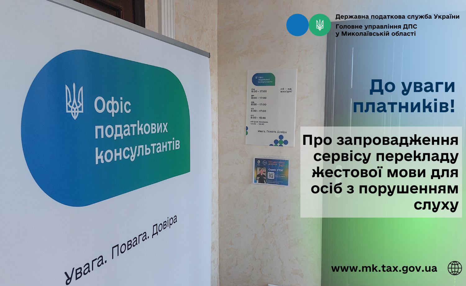 Наразі сервіс перекладу жестової мови діє у центрах обслуговування платників та Офісі податкових консультантів Головного управління ДПС у Миколаївській області.