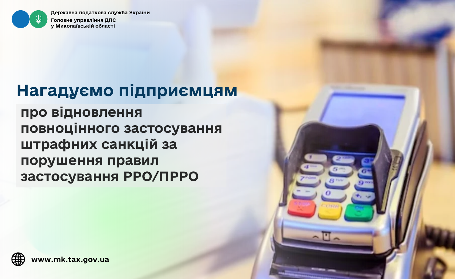 Головне управління ДПС у Миколаївській області звертає увагу, що 01 серпня 2025 року завершився перехідний період, під час якого діяв зменшений розмір штрафів за порушення правил застосування реєстраторів розрахункових операцій/програмних реєстраторів розрахункових операцій (далі – РРО/ПРРО).