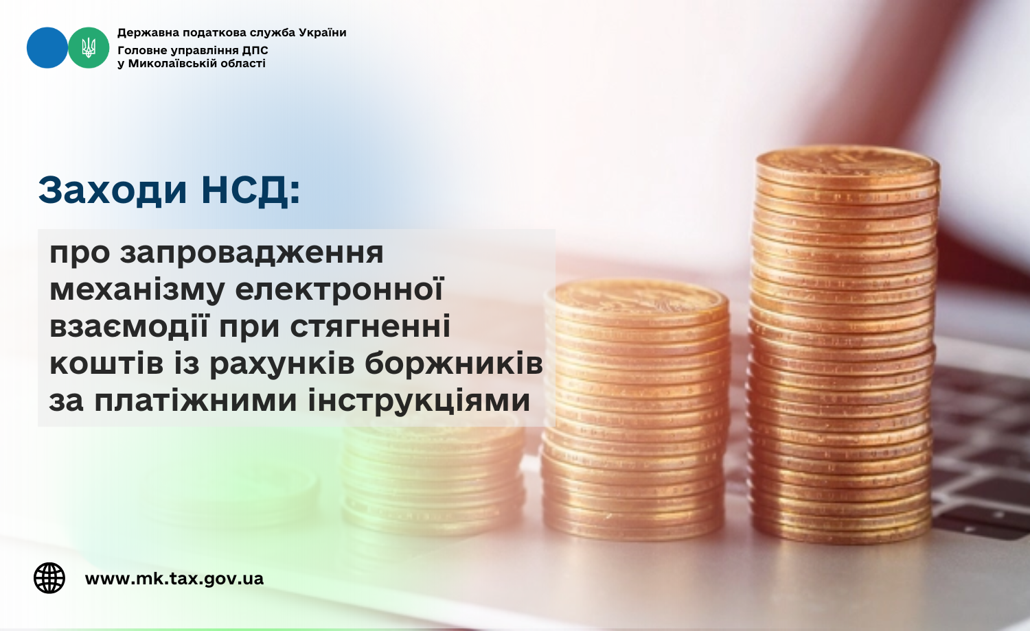 Серед заходів ДПС із впровадження НСД у 2024 – 2025 роках, зокрема удосконалення процедури стягнення коштів із банківських рахунків боржників шляхом налагодження інформаційної взаємодії ДПС із Держказначейством та банками щодо направлення електронних платіжних інструкцій (інкасових доручень) на примусове списання (стягнення) коштів із рахунків платника у банках. Виконання цієї процедури передбачає законодавче запровадження механізму електронної взаємодії при стягненні коштів із рахунків боржників за платіжними інструкціями, сформованими в електронній формі.