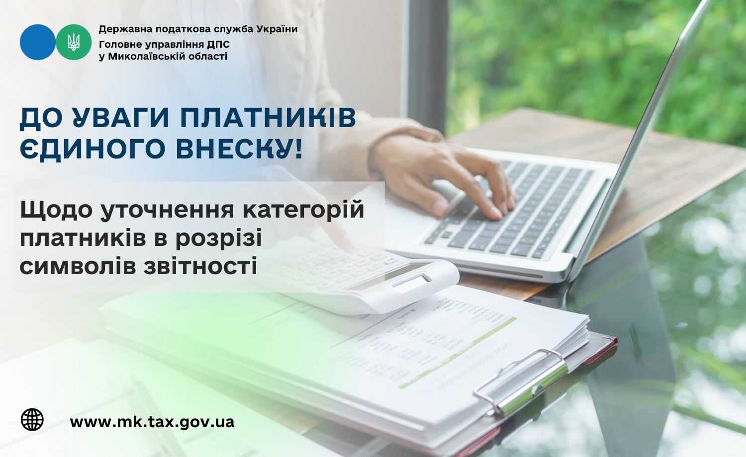 Головне управління ДПС у Миколаївській області звертає увагу, що з метою уточнення символів звітності, за якими необхідно сплачувати єдиний внесок, відповідно до чинної редакції постанови Кабінету Міністрів України від 26 листопада 2014 року № 675 «Про затвердження пропорцій розподілу єдиного внеску на загальнообов’язкове державне соціальне страхування» та з урахуванням наказу Державної казначейської служби України від 08.12.2025 № 301 «Про внесення змін до Довідника відповідності символу звітності пропорціям розподілу єдиного внеску на загальнообов’язкове державне соціальне страхування» у «Реквізитах рахунків для сплати єдиного внеску на загальнообов’язкове державне соціальне страхування» оновлено інформацію щодо категорій платників єдиного внеску в розрізі символів звітності.