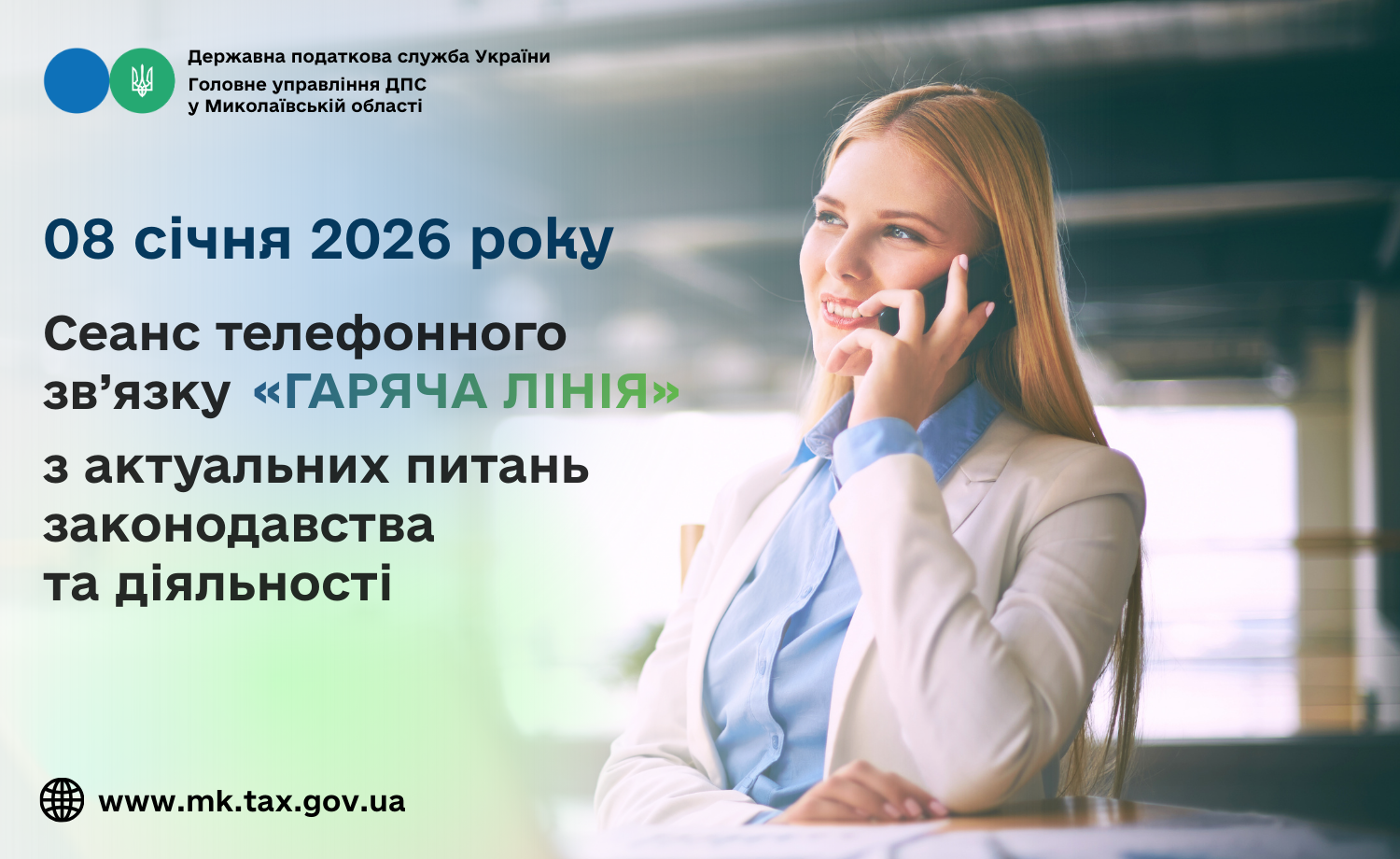 Головне управління ДПС у Миколаївській області проводить з 10 год. 00 хв. до 11 год. 00 хв. 08 січня 2026 року сеанс телефонного зв’язку «гаряча лінія» з актуальних питань законодавства та діяльності