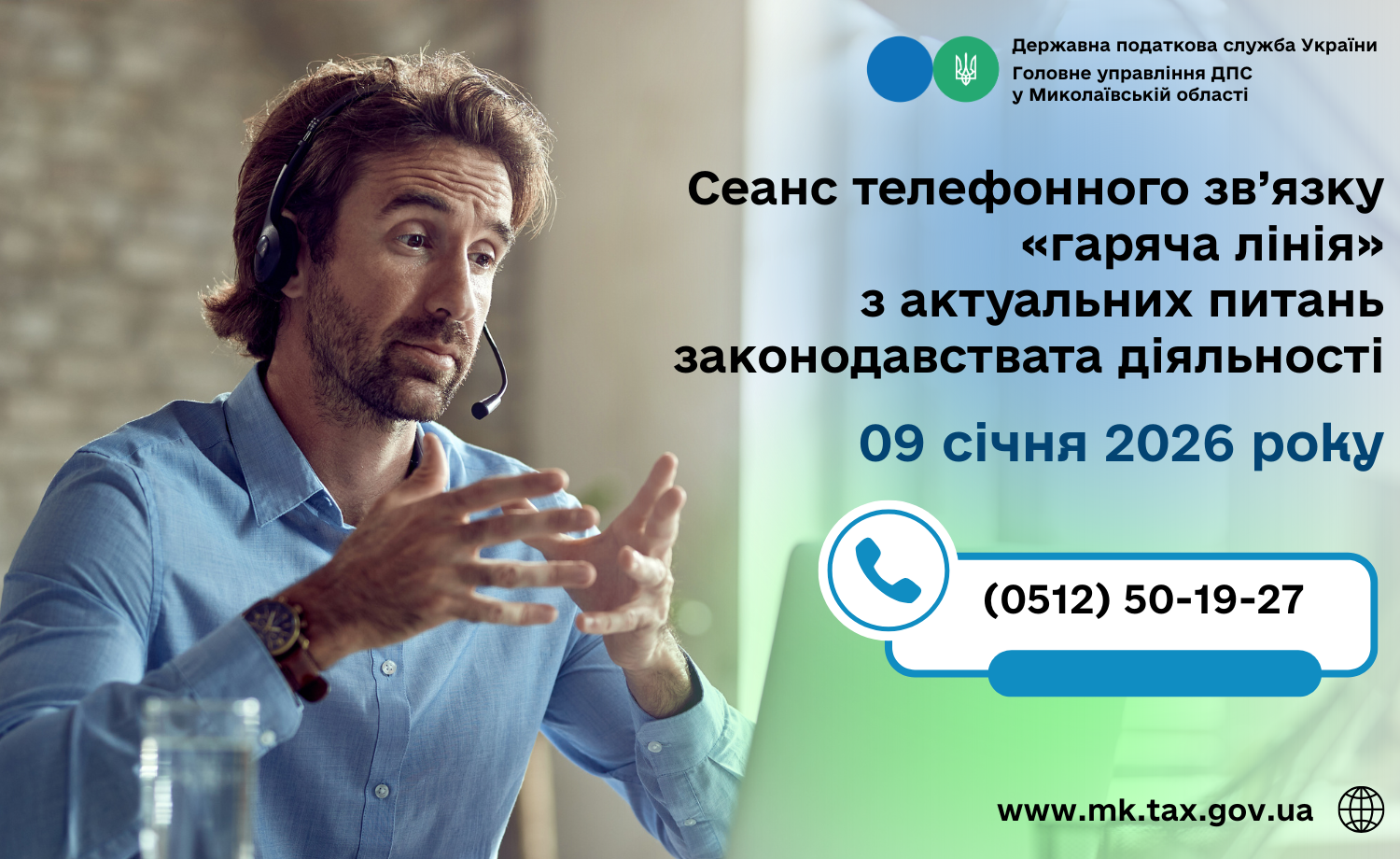 Головне управління ДПС у Миколаївській області проводить з 13 год. 00 хв. до 14 год. 00 хв. 09 січня 2026 року сеанс телефонного зв’язку «гаряча лінія» з актуальних питань законодавства та діяльності.