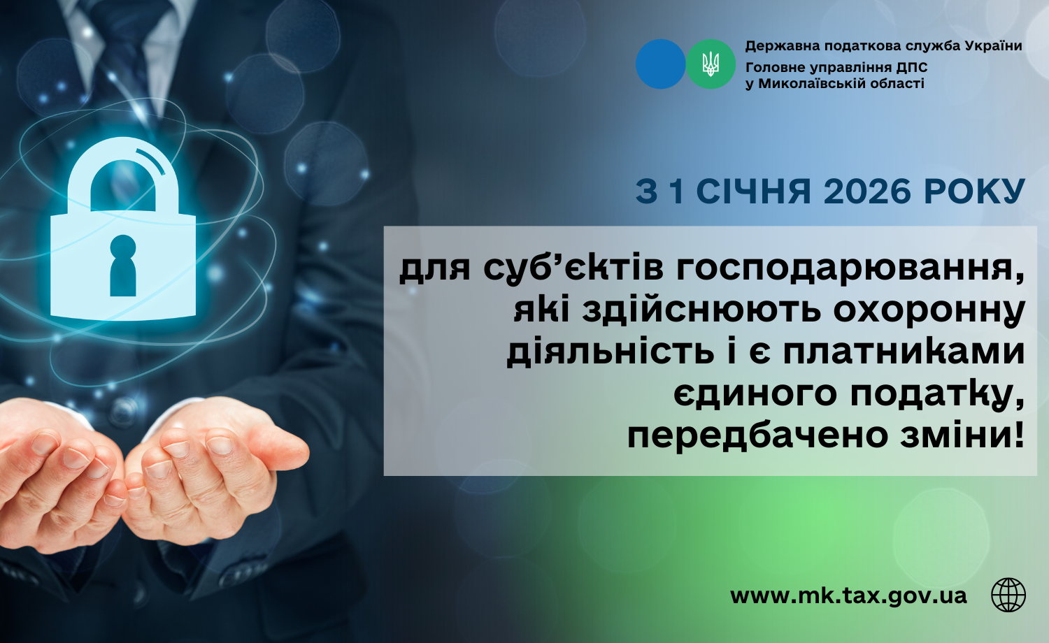 Головне управління ДПС у Миколаївській області повідомляє, що з 01 січня 2026 року суб’єкти господарювання, які здійснюють охоронну діяльність, не можуть бути платниками єдиного податку. Відповідні зміни передбачено Законом України від 03 грудня 2025 року № 4698-ІХ «Про внесення змін до Податкового кодексу України та інших законів України щодо особливостей оподаткування банків податком на прибуток підприємств у 2026 році та перенесення строків введення в дію Електронної системи обігу алкогольних напоїв, тютюнових виробів та рідин, що використовуються в електронних сигаретах» (далі – Закон № 4698), який набрав чинності 26 грудня 2025 року.