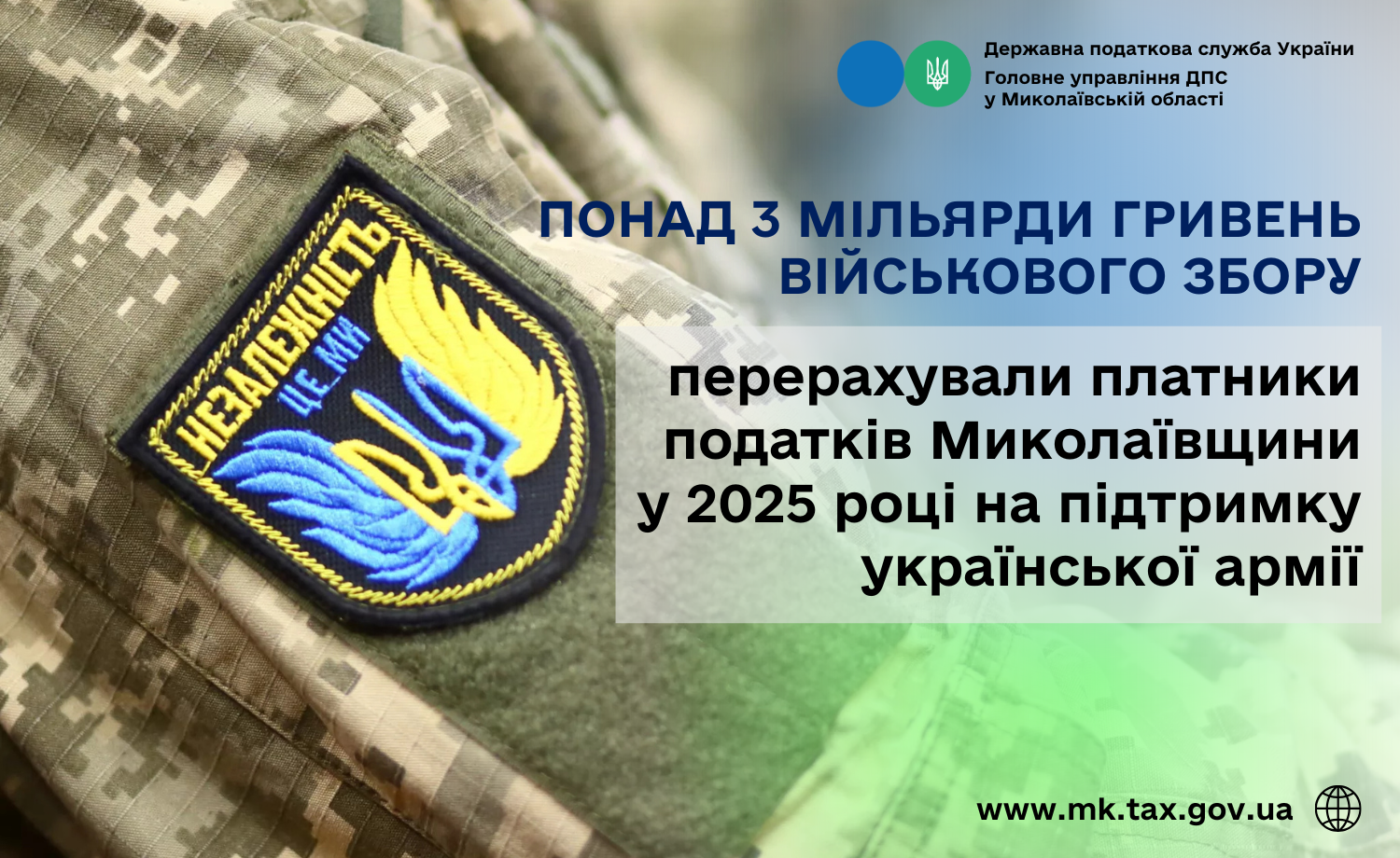 Платники податків Миколаївщини у 2025 році перерахували на підтримку української армії понад 3 мільярди гривень військового збору