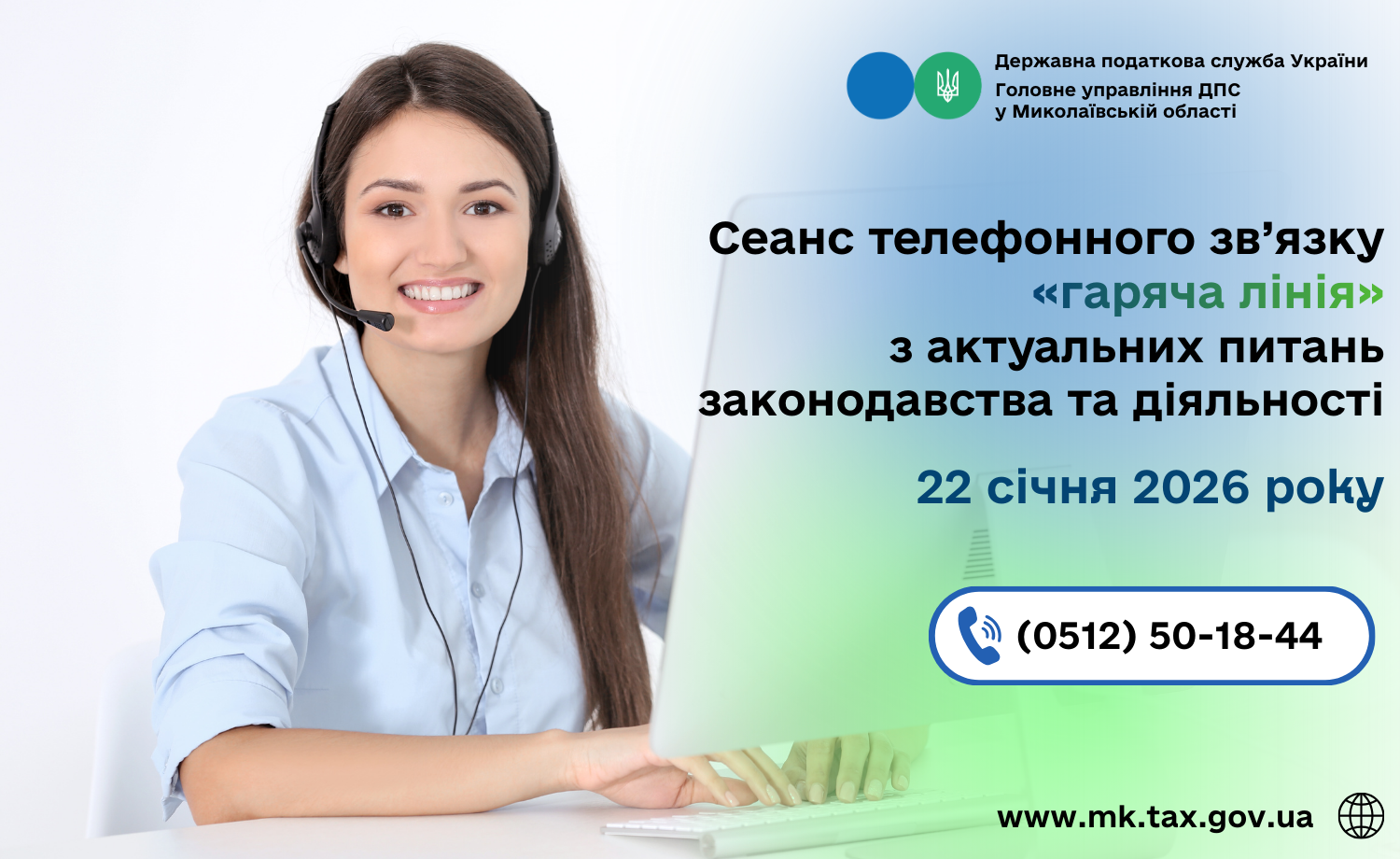 Головне управління ДПС у Миколаївській області проводить з 10 год. 00 хв. до 11 год. 00 хв. 22 січня 2026 року сеанс телефонного зв’язку «гаряча лінія» з актуальних питань законодавства та діяльності