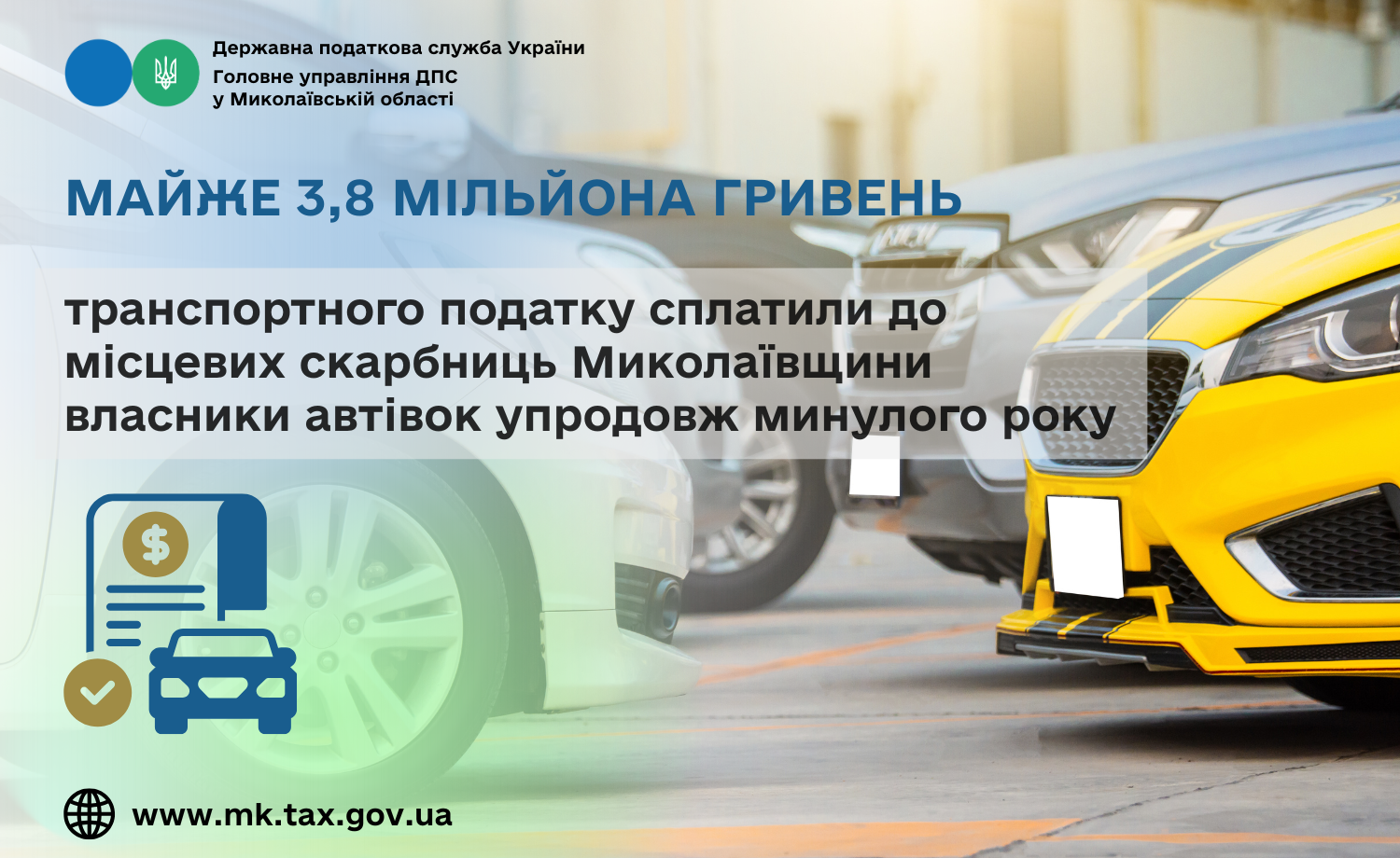 У січні – грудні 2025 року до місцевих бюджетів Миколаївщини забезпечено 3,8 мільйона гривень транспортного податку, що на 355 тис. грн більше, ніж за 12 місяців 2024 року.