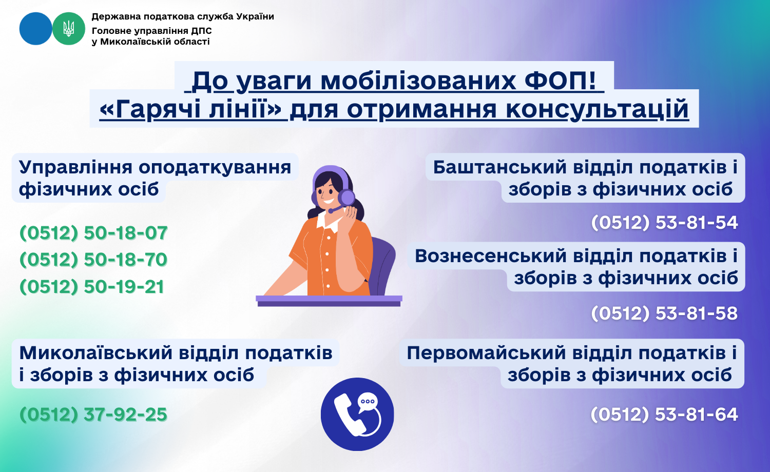 Головне управління ДПС у Миколаївській області повідомляє про створення «гарячих ліній» для надання консультацій мобілізованим платникам податків – фізичним особам, які не можуть виконувати податкові зобов’язання, чи членам їхніх родин.