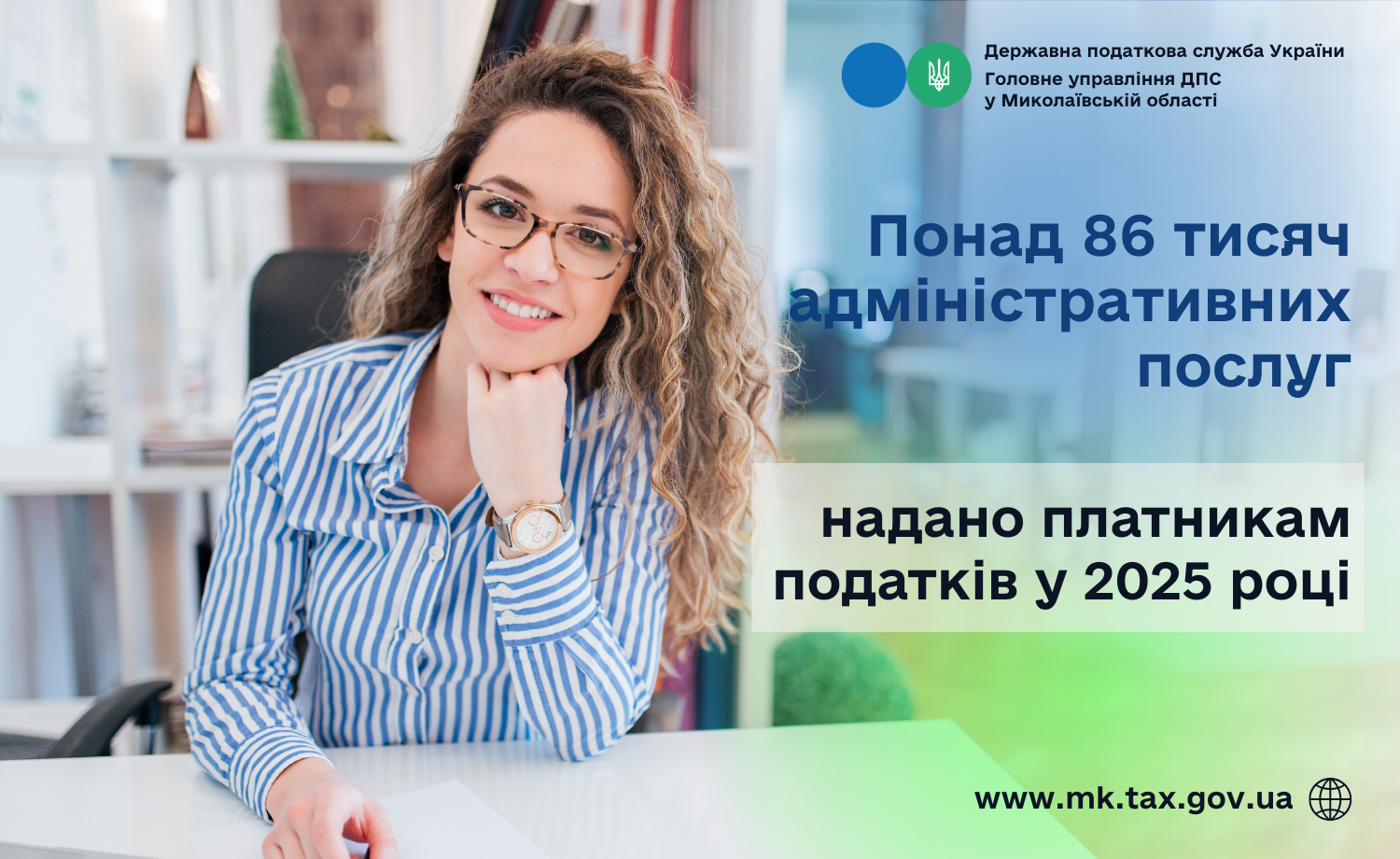 У січні – грудні 2025 року платники податків Миколаївщини отримали понад 86 тисяч адміністративних послуг. Про це повідомили в управлінні податкових сервісів Головного управління ДПС у Миколаївській області.
