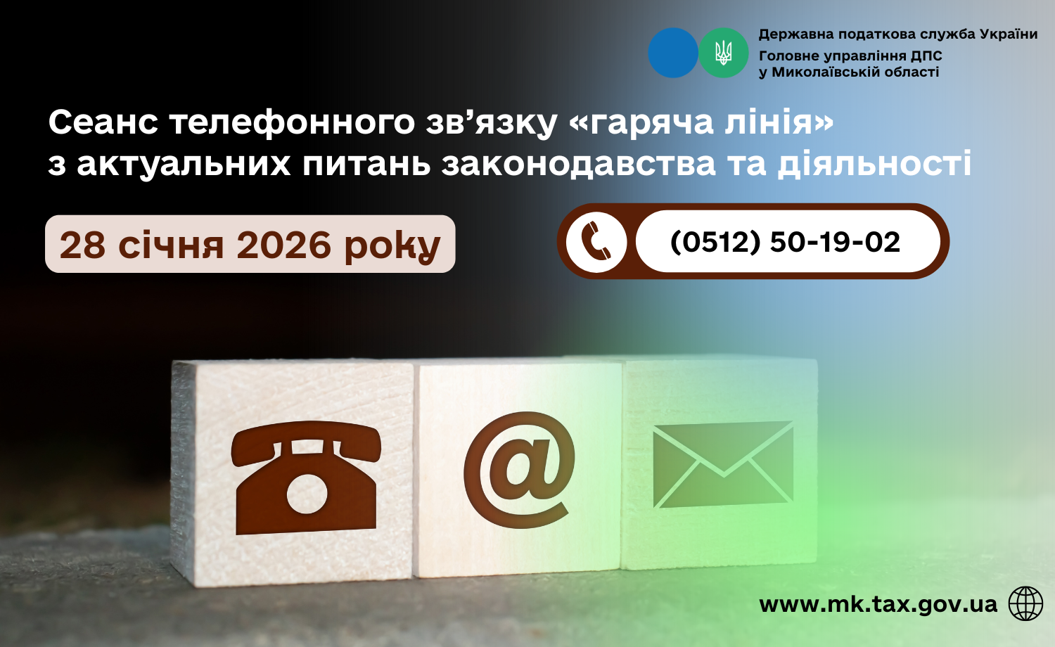 Головне управління ДПС у Миколаївській області проводить з 10 год. 00 хв. до 11 год. 00 хв. 28 січня 2026 року сеанс телефонного зв’язку «гаряча лінія» з актуальних питань законодавства та діяльності