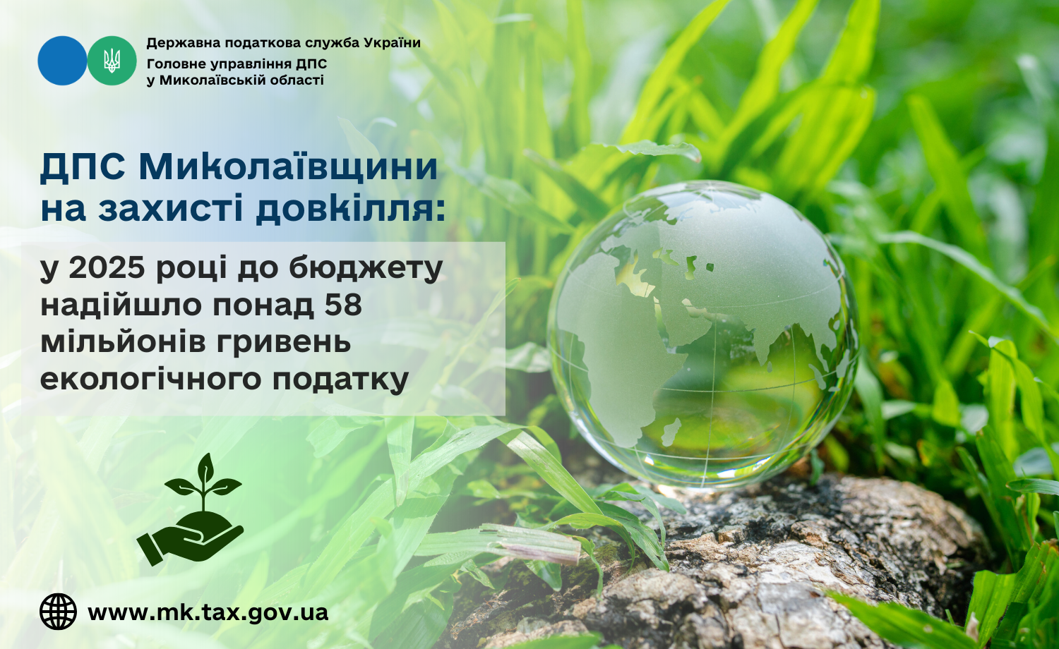 Головне управління ДПС у Миколаївській області повідомляє, що у січні – грудні 2025 року до зведеного бюджету забезпечено екологічного податку у сумі 58,2 млн гривень.