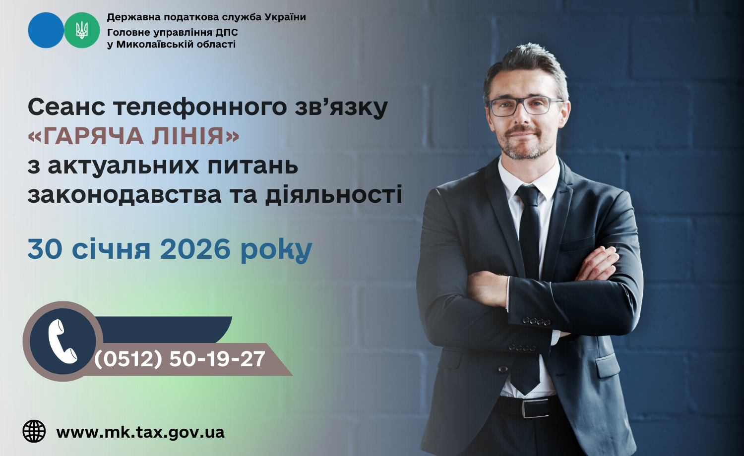 Головне управління ДПС у Миколаївській області проводить з 13 год. 00 хв. до 14 год. 00 хв. 30 січня 2026 року сеанс телефонного зв’язку «гаряча лінія» з актуальних питань законодавства та діяльності