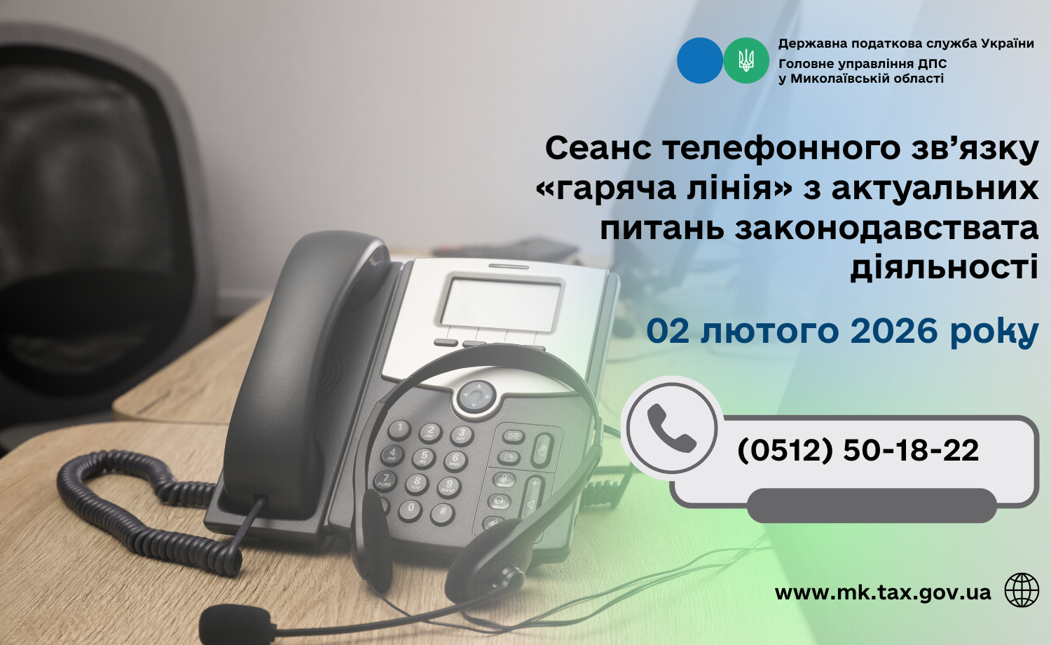 Головне управління ДПС у Миколаївській області проводить з 10 год. 00 хв. до 11 год. 00 хв. 02 лютого 2026 року сеанс телефонного зв’язку «гаряча лінія» з актуальних питань законодавства та діяльності